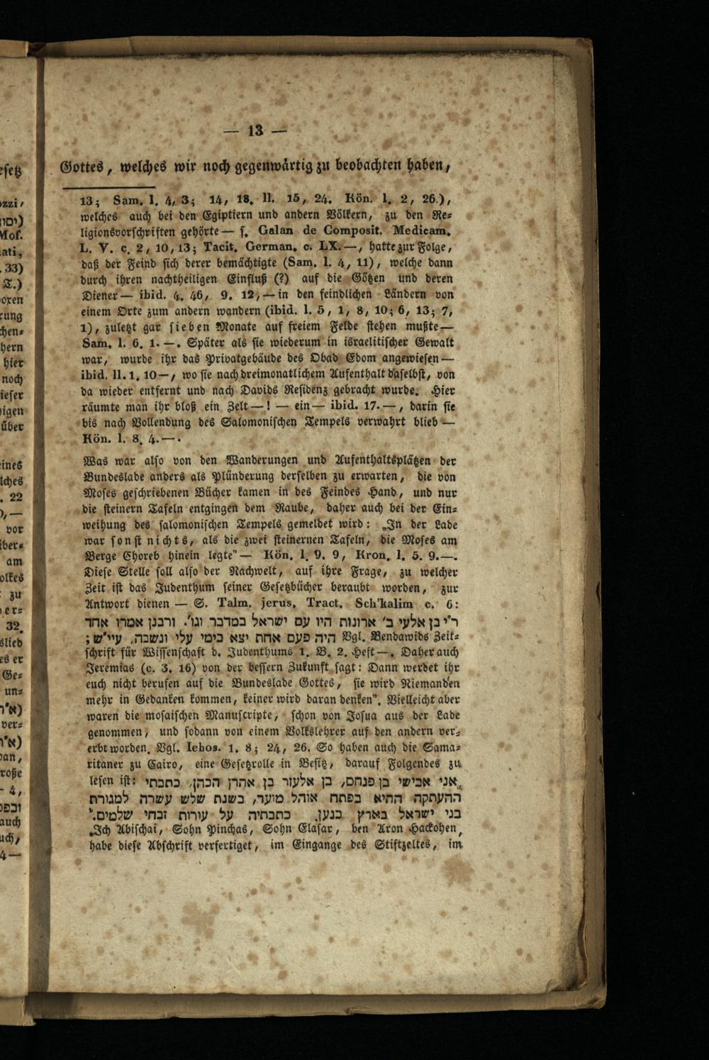 Was war also von den Wanderungen und Aufenthaltsplägen der Bundeslade anders als Plünderung derselben zu erwarten, die von Moses geschriebenen Bücher kamen in des Feindes Hand, und nur die steinern Tafeln entgingen dem Raube, daher auch bei der Einweihung des salomonischen Tempels gemeldet wird:" In der Lade war sonst nichts, als die zwei steinernen Tafeln, die Moses am Berge Choreb hinein legte"- Kön, 1, 9. 9, Kron, 1, 5. 9.-. Diese Stelle soll also der Nachwelt, auf ihre Frage, zu welcher Zeit ist das Judenthum seiner Gesegbücher beraubt worden, zur Antwort dienen S. Talm. jerus, Tract. Sch'kalim c. 6: