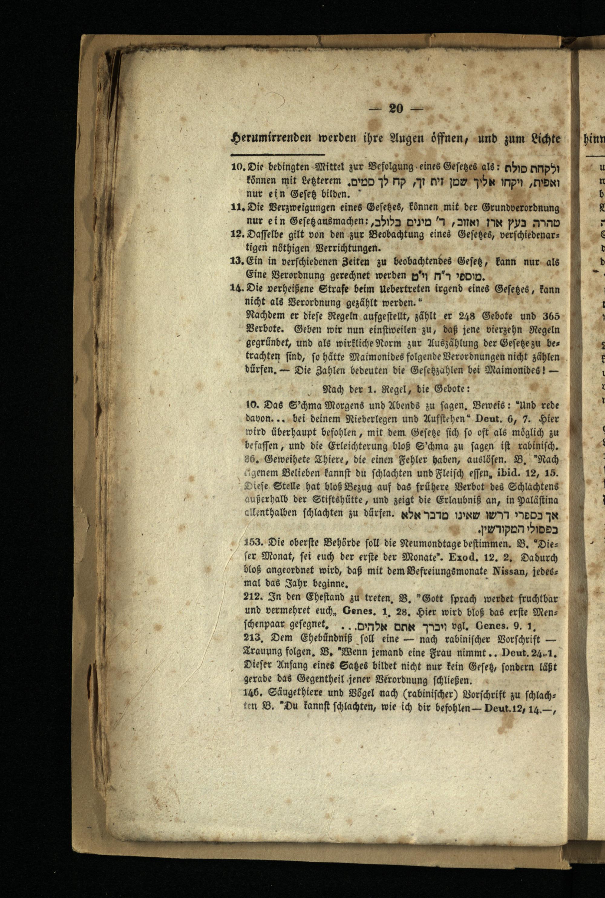 10. Das S'chma Morgens und Abends zu sagen. Beweis:" Und rede davon... bei deinem Niederlegen und Aufstehen" Deut. 6, 7. Hier wird überhaupt befohlen, mit dem Gefeße sich so oft als möglich zu befassen, und die Erleichterung bloß S'chma zu sagen ist rabinisch. 86. Geweihete Thiere, die einen Fehler haben, auslösen. B." Nach eigenem Belieben kannst du schlachten und Fleisch essen, ibid. 12, 15. Diese Stelle hat bloß Bezug auf das frühere Verbot des Schlächtens außerhalb der Stiftshütte, und zeigt die Erlaubniß an, in Palästina