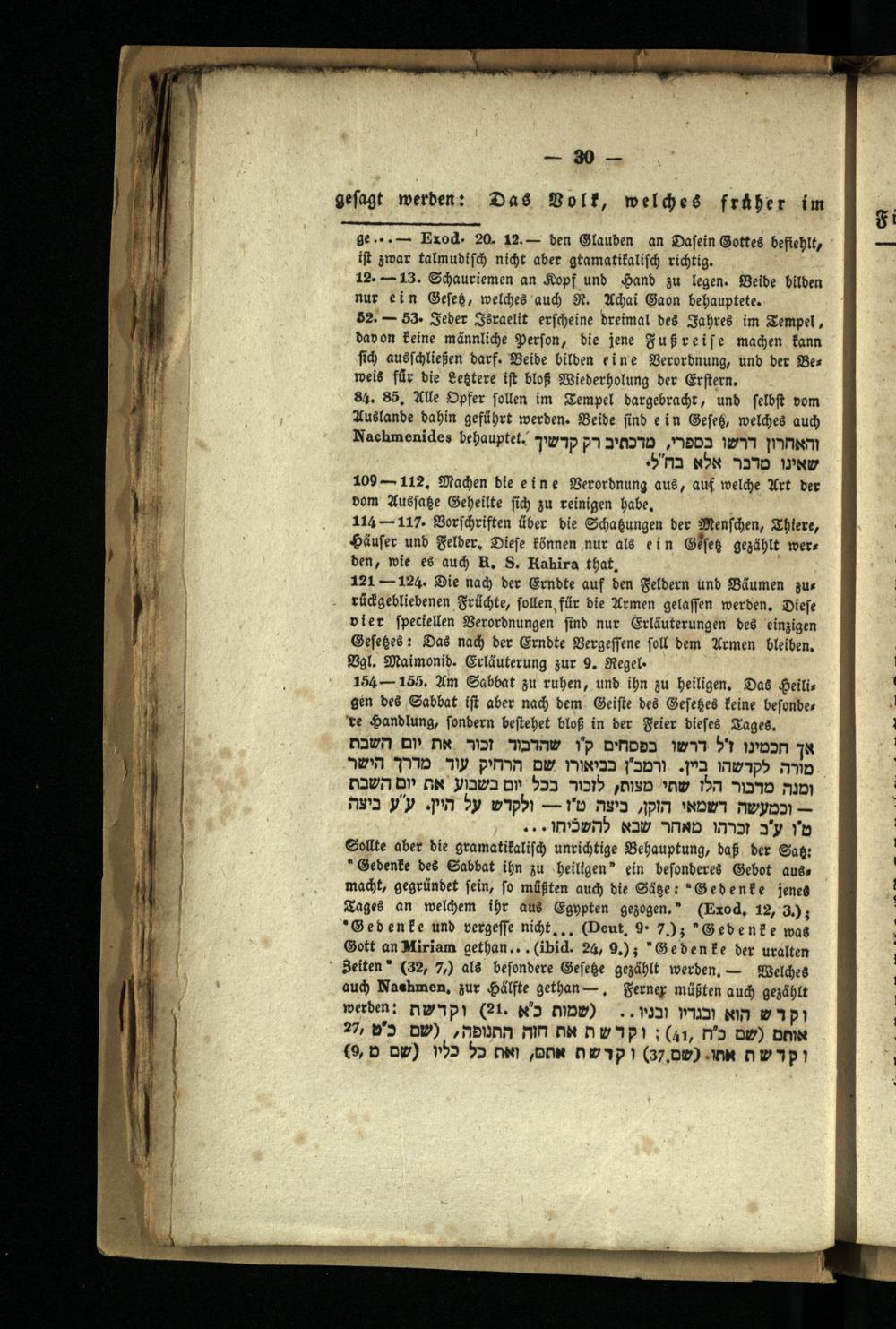 Sollte aber die gramatikalisch unrichtige Behauptung, daß der Sas: Gedenke des Sabbat ihn zu heiligen" ein besonderes Gebot auss macht, gegründet sein, so müßten auch die Säße:" Gedenke jenes Tages an welchem ihr aus Egypten gezogen."( Exod. 12, 3.); Gedenke und vergesse nicht...( Deut. 9. 7.);" Gedenke was Gott an Miriam gethan...( ibid. 24, 9.);" Gedenke der uralten Beiten( 32, 7,) als besondere Geseze gezählt werden. Welches auch Naehmen, zur Hälfte gethan-. Ferner müßten auch gezählt