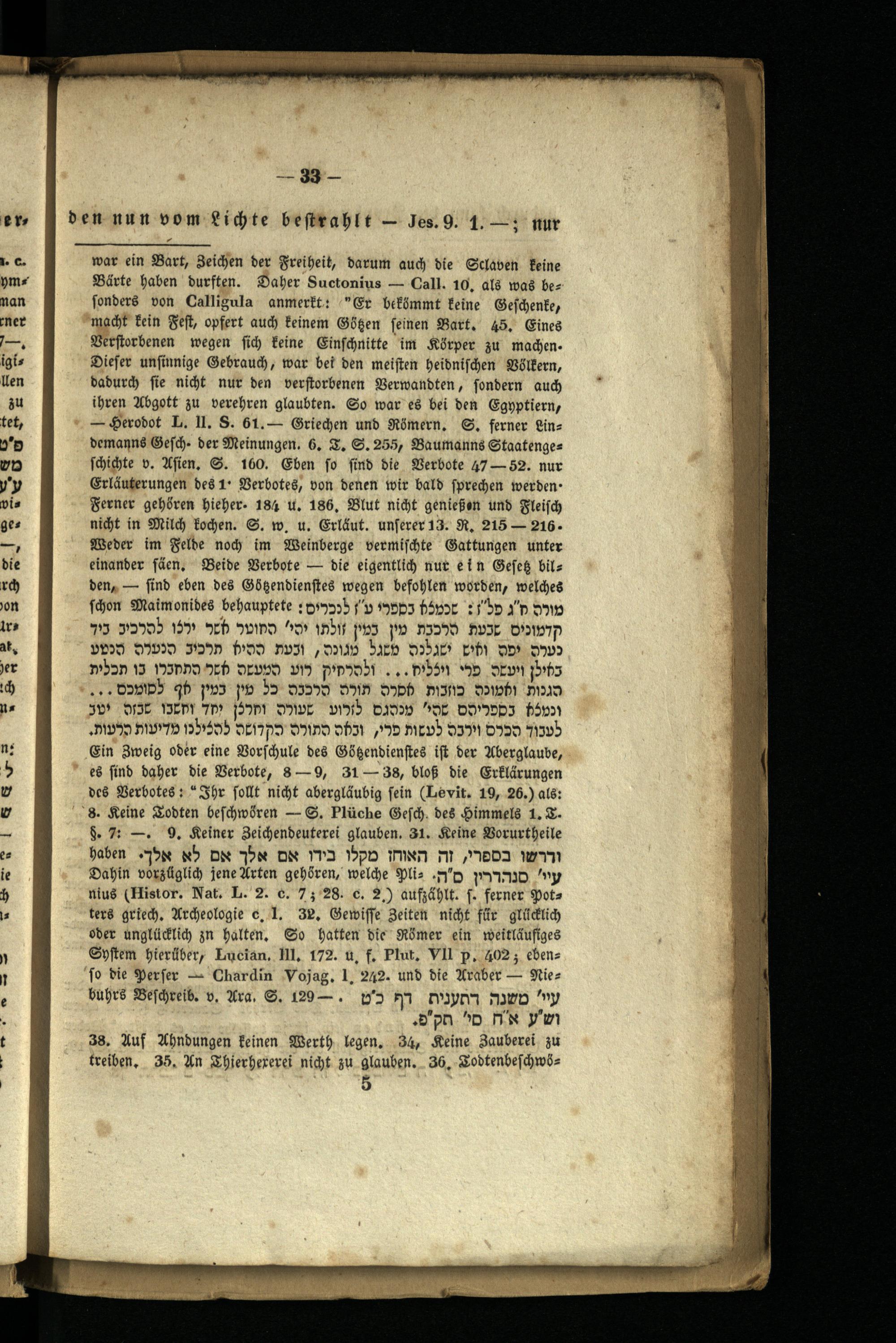 war ein Bart, Zeichen der Freiheit, darum auch die Sclaven keine Bärte haben durften. Daher Suctonius Call. 10, als was be= sonders von Calligula anmerkt:" Er bekömmt keine Geschenke, macht kein Fest, opfert auch keinem Gözen seinen Bart. 45. Eines Verstorbenen wegen sich keine Einschnitte im Körper zu machen. Dieser unsinnige Gebrauch, war bei den meisten heidnischen Völkern, dadurch sie nicht nur den verstorbenen Verwandten, sondern auch ihren Abgott zu verehren glaubten. So war es bei den Egyptiern, Herodot L. 11. S. 61. Griechen und Römern. S. ferner Lin= demanns Gesch. der Meinungen. 6. T. S. 255, Baumanns Staatenge= schichte v. Asien. S. 160. Eben so sind die Verbote 47-52. nur Erläuterungen des 1. Verbotes, von denen wir bald sprechen werden. Ferner gehören hieher. 184 u. 186. Blut nicht genießen und Fleisch nicht in Milch kochen. S. w. u. Erläut. unserer 13. R. 215-216. Weder im Felde noch im Weinberge vermischte Gattungen unter einander fäen. Beide Verbote die eigentlich nur ein Gesek bilden, sind eben des Gözendienstes wegen befohlen worden, welches