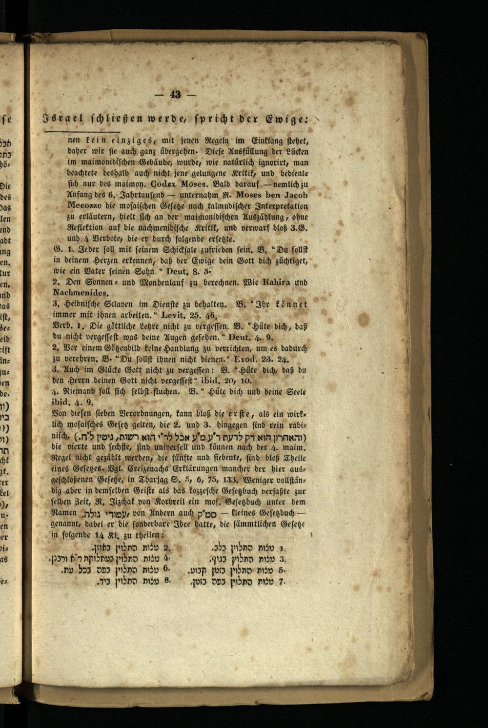 nen fein einziges, mit jenen Regeln im Einklang stehet, daher wir sie auch ganz übergehen. Diese Ausfüllung der Lücken im maimonidischen Gebäude, wurde, wie natürlich ignorirt, man beachtete deshalb auch nicht jene gelungene Kritik, und bediente sich nur des maimon. Codex Moses . Bald darauf-nemlich zu Anfang des 6. Jahrtausend unternahm R. Moses ben Jacob. Mecozze die mosaischen Geseze nach talmudischer Interpretation zu erläutern, hielt sich an der maimonidischen Auszählung, ohne Reflektion auf die nachmenidische Kritik, und verwarf bloß 3.G. und 4 Verbote, die er durch folgende erfekte.
