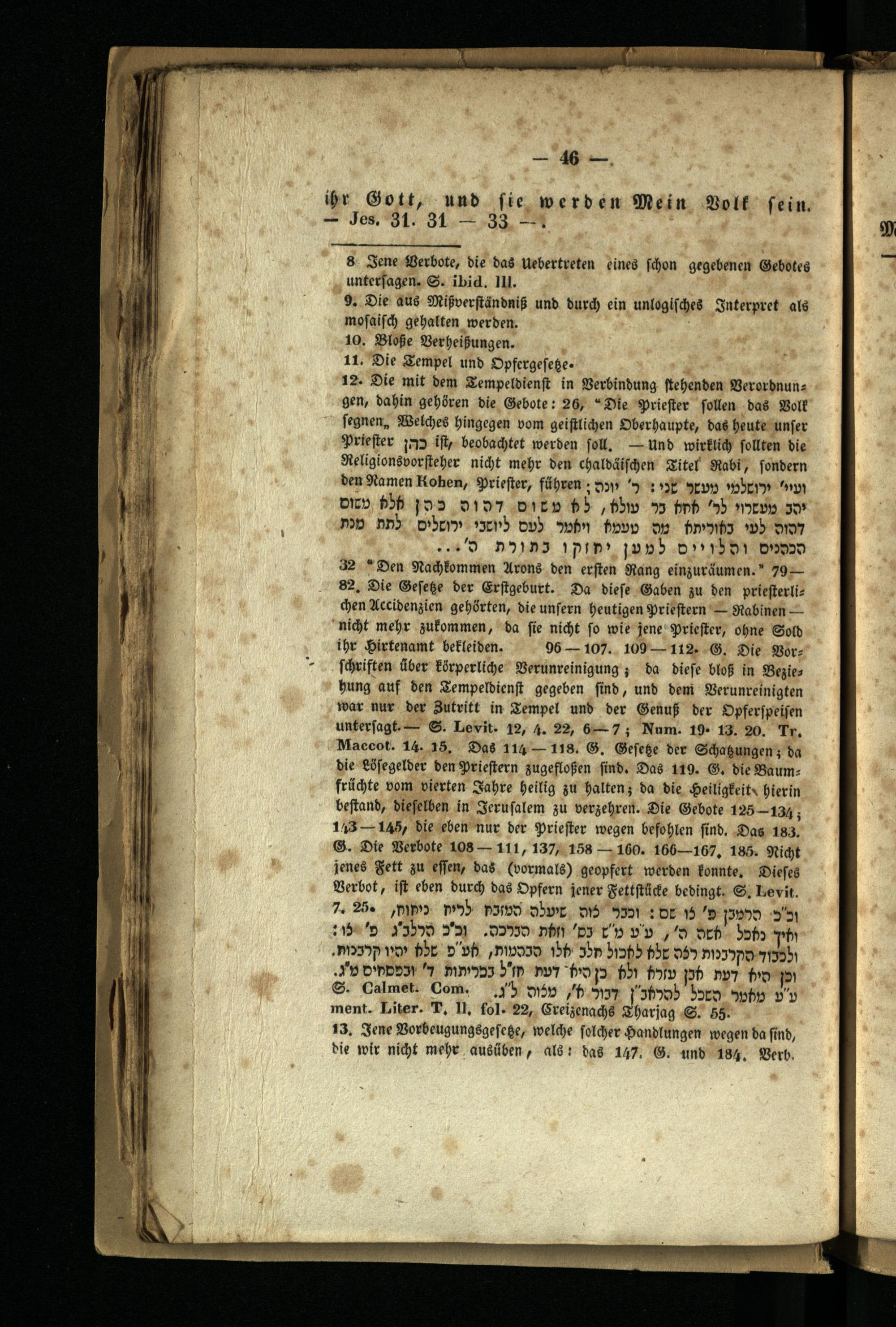 12. Die mit dem Tempeldienst in Verbindung stehenden Verordnun= gen, dahin gehören die Gebote: 26," Die Priester sollen das Volk segnen, Welches hingegen vom geistlichen Oberhaupte, das heute unser Priester 17 ist, beobachtet werden soll.- und wirklich sollten die Religionsvorsteher nicht mehr den chaldäischen Titel Rabi, sondern den Namen Kohen, Priester, führen; 51: