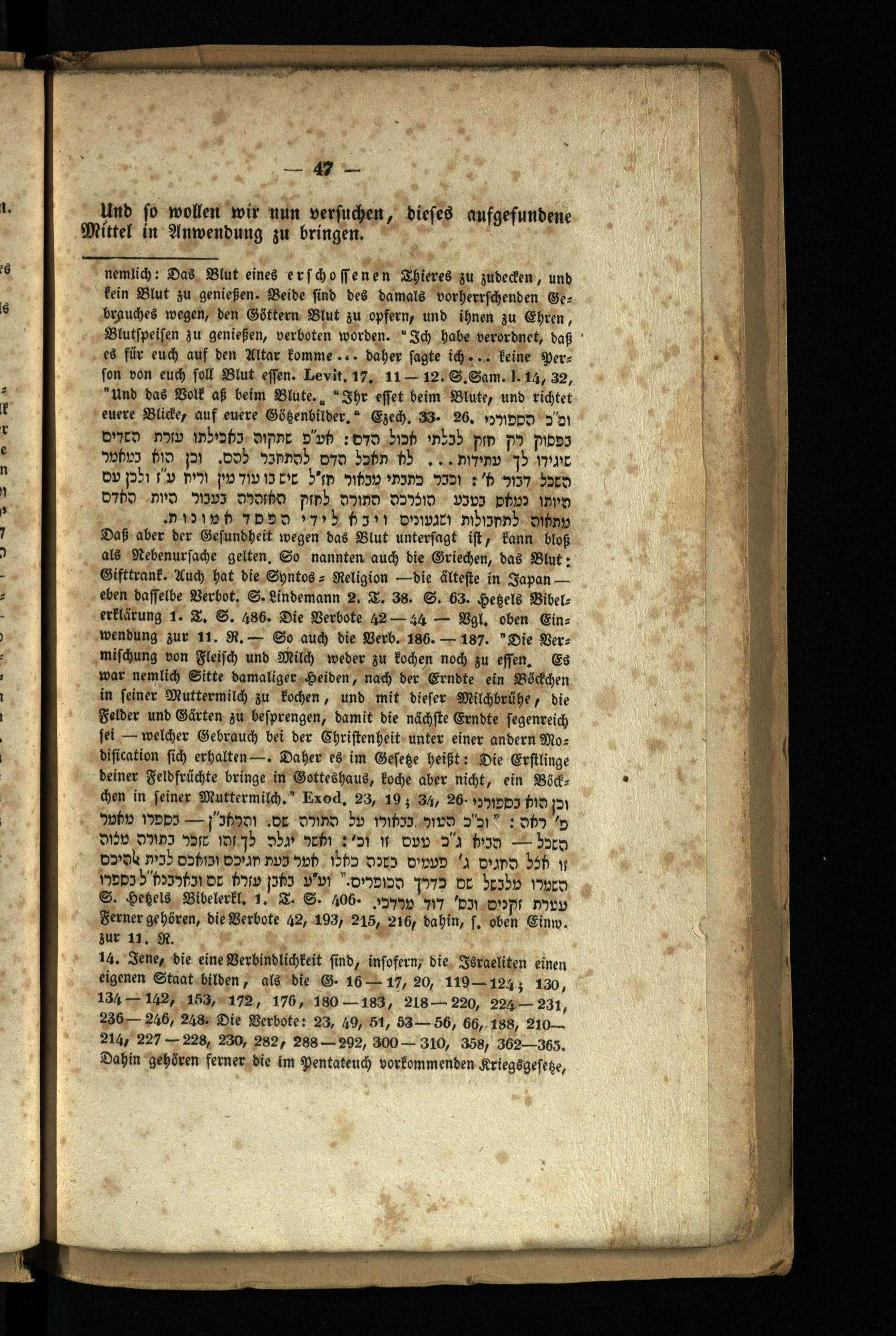 nemlich: Das Blut eines erschossenen Thieres zu zudecken, und kein Blut zu genießen. Beide sind des damals vorherrschenden Gebrauches wegen, den Göttern Blut zu opfern, und ihnen zu Ehren, Blutspeisen zu genießen, verboten worden." Ich habe verordnet, daß es für euch auf den Altar komme... daher sagte ich... keine Person von euch soll Blut effen. Levit, 17, 11-12. S.Sam. 1. 14, 32, " Und das Volk aß beim Blute." Ihr effet beim Blute, und richtet euere Blicke, auf euere Gößenbilder." Ezech. 33. 26. 1971DDD 5'1