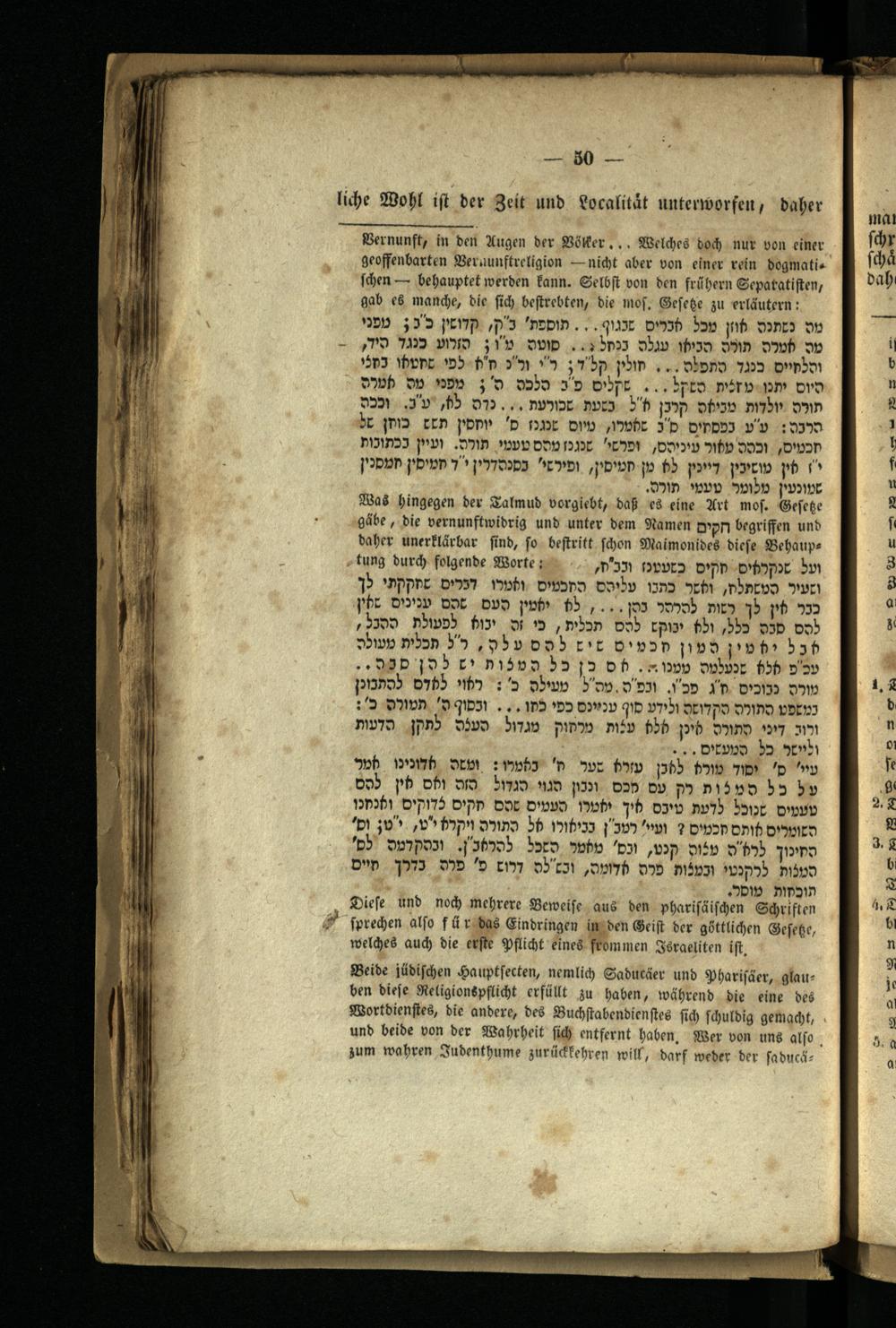 Beide jüdischen Hauptfecten, nemlich Saducäer und Pharisäer, glauben diese Religionspflicht erfüllt zu haben, während die eine des Wortdienstes, die andere, des Buchstabendienstes sich schuldig gemacht, und beide von der Wahrheit sich entfernt haben. Wer von uns also zum wahren Judenthume zurückkehren will, darf weder der faducä
