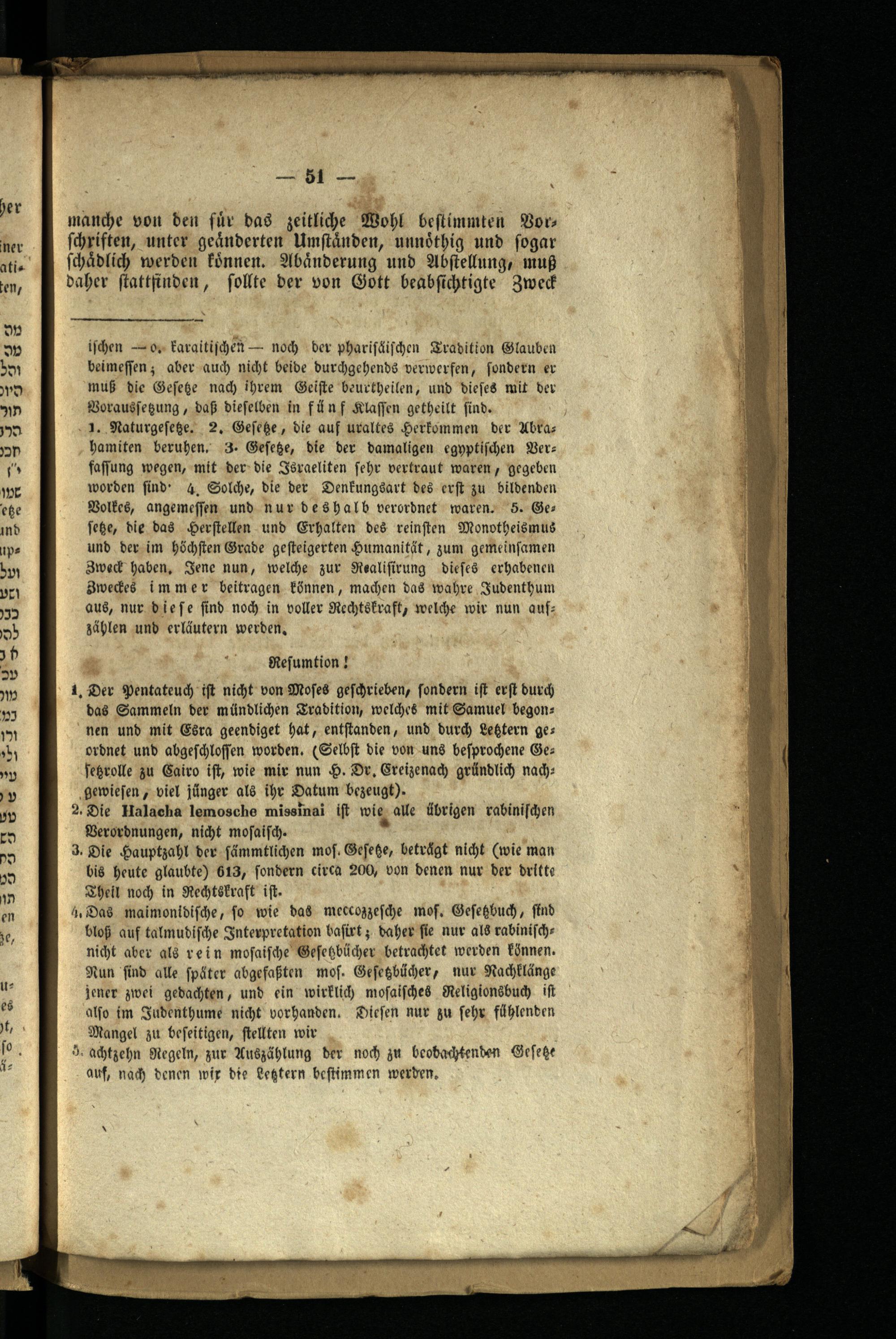1. Naturgeſetze. 2. Geſetze, die auf uraltes Herkommen der Abrahamiten beruhen. 3. Geſetze, die der damaligen egyptiſchen Ver— faſſung wegen, mit der die Israeliten ſehr vertraut waren, gegeben worden find‘ 4. Solche, die der Denkungsart des erſt zu bildenden Volkes, angemeſſen und nur deshalb verordnet waren. 5. Ges ſetze, die das Herſtellen und Erhalten des reinſten Monotheismus und der im höchſten Grade geſteigerten Humanität, zum gemeinſamen Zweck haben. Jene nun, welche zur Realiſirung dieſes erhabenen Zweckes immer beitragen können, machen das wahre Judenthum aus, nur dieſe find noch in voller Rechtskraft, welche wir nun auſzählen und erläutern werden.