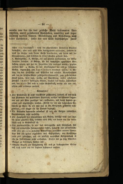 4. Das maimonidiſche, fo wie das meccozzeſche moſ. Geſetzbuch, ſtnd bloß auf talmudiſche Interpretation baſirt; daher fie nur als rabiniſchnicht aber als rein moſaiſche Geſetzbücher betrachtet werden können. Nun find alle ſpaͤter abgefaßten moſ. Geſetzbücher, nur Nachklänge jener zwei gedachten, und ein wirklich moſaiſches Religionsbuch iſt alſo im Judenthume nicht vorhanden. Dieſen nur zu ſehr fühlenden Mangel zu beſeitigen, ſtellten wir