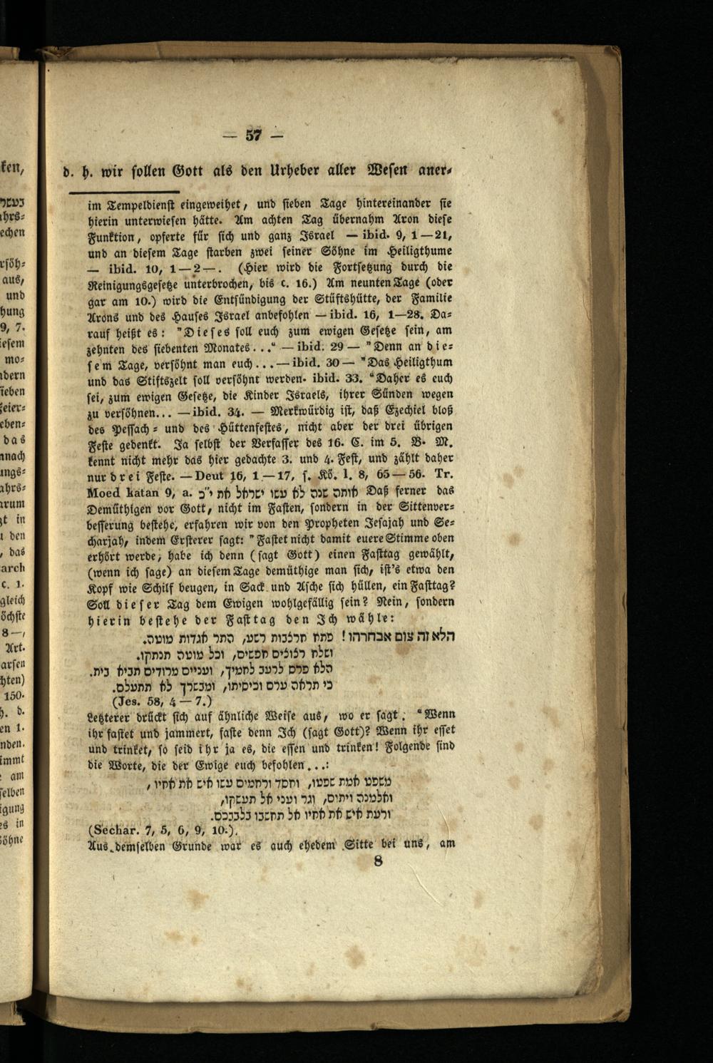 Demüthigen vor Gott, nicht im Fasten, sondern in der Sittenverbefferung bestehe, erfahren wir von den Propheten Jesajah und Se charjah, indem Ersterer sagt:" Fastet nicht damit euere Stimme oben erhört werde, habe ich denn( fsagt Gott) einen Fasttag gewählt, ( wenn ich sage) an diesem Tage demüthige man sich, ist's etwa den Kopf wie Schilf beugen, in Sack und Asche sich hüllen, ein Fasttag? Soll dieser Tag dem Ewigen wohlgefällig sein? Nein, sondern hierin bestehe der Fast tag den Ich wähle:
