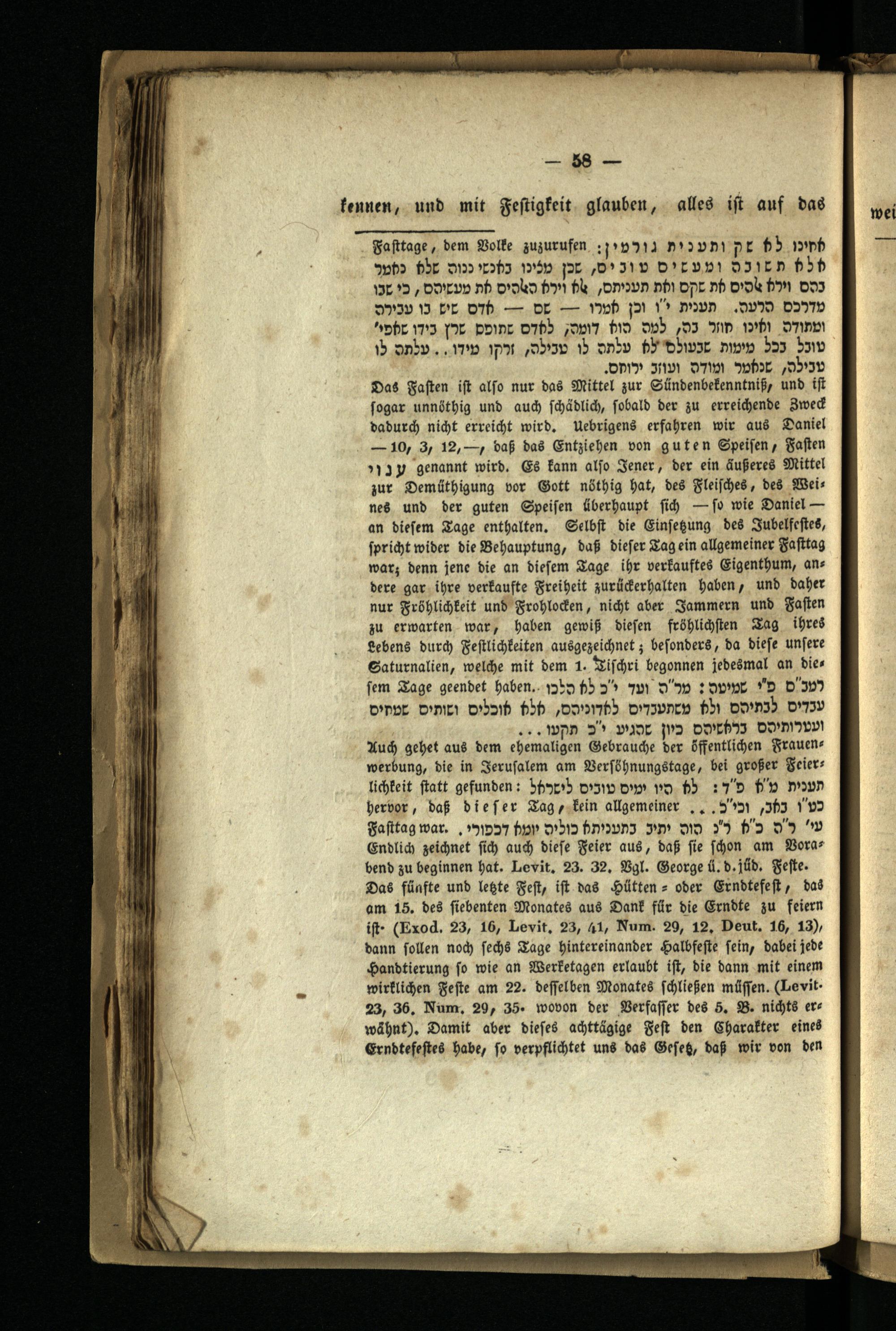 10, 3, 12, daß das Entziehen von guten Speisen, Fasten 13y genannt wird. Es kann also Jener, der ein äußeres Mittel zur Demüthigung vor Gott nöthig hat, des Fleisches, des Weis - fo wie Daniel- nes und der guten Speisen überhaupt sich an diesem Tage enthalten. Selbst die Einsegung des Jubelfestes, spricht wider die Behauptung, daß dieser Tag ein allgemeiner Fafttag war, denn jene die an diesem Tage ihr verkauftes Eigenthum, ans dere gar ihre verkaufte Freiheit zurückerhalten haben, und daher nur Fröhlichkeit und Frohlocken, nicht aber Jammern und Fasten zu erwarten war, haben gewiß diesen fröhlichsten Tag ihres Lebens durch Festlichkeiten ausgezeichnet; besonders, da diese unsere Saturnalien, welche mit dem 1. Tischri begonnen jedesmal an dies