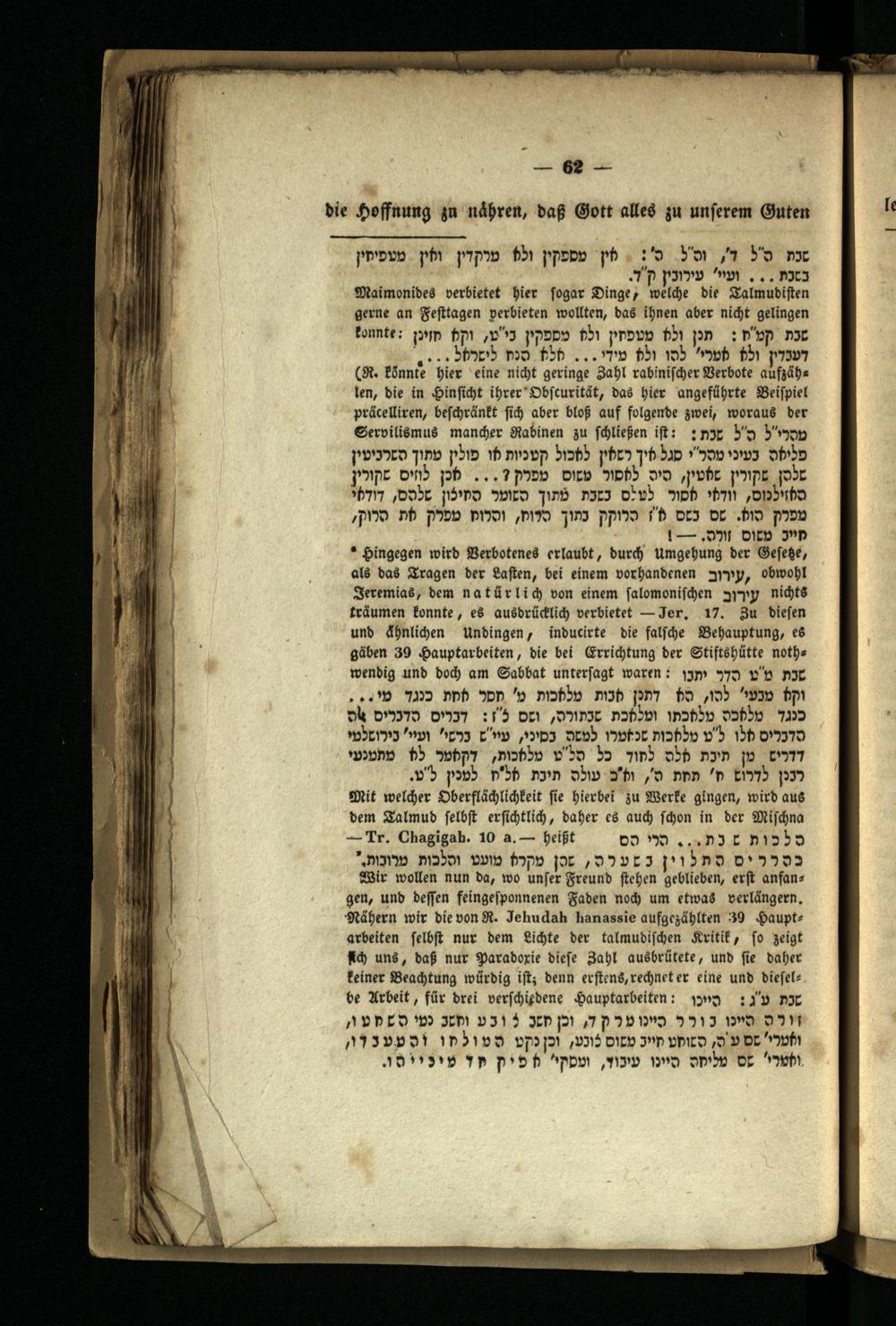Wir wollen nun da, wo unser Freund stehen geblieben, erst anfangen, und dessen feingesponnenen Faden noch um etwas verlängern. Nähern wir die von R. Jehudah hanassie aufgezählten 39 Hauptarbeiten selbst nur dem Lichte der talmudischen Kritik, so zeigt ch uns, daß nur Paradorie diese Zahl ausbrütete, und sie daher keiner Beachtung würdig ist, denn erstens, rechnet er eine und diesel-.