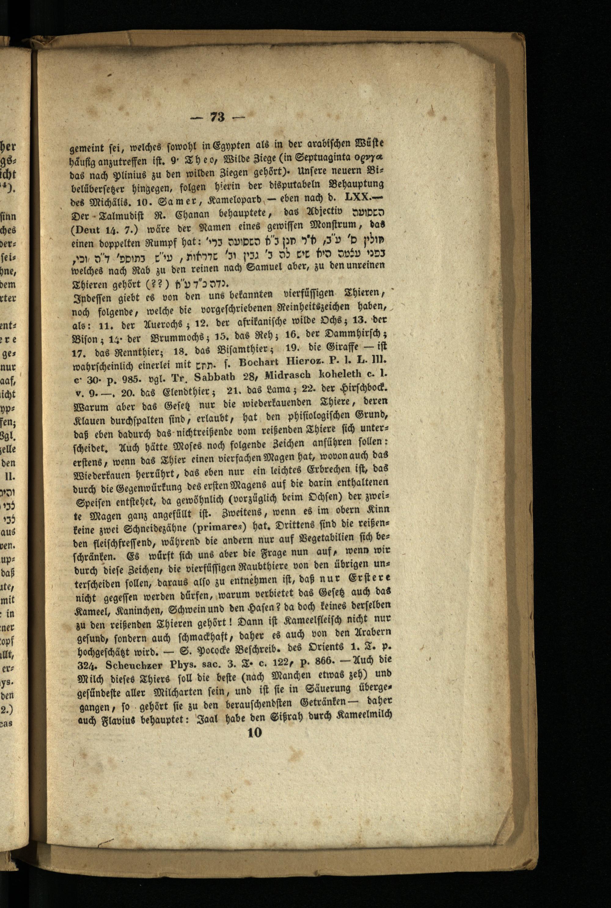 Indessen giebt es von den uns bekannten vierfüssigen Thieren, noch folgende, welche die vorgeschriebenen Reinheitszeichen haben, als: 11. der Auerochs; 12. der afrikanische wilde Ochs; 13. der Bison; 14 der Brummochs; 15. das Reh; 16. der Dammhirsch; 17. das Rennthier; 18. das Bisamthier; 19. die Giraffe wahrscheinlich einerlei mit Enn. f. Bochart Hieroz. P. 1. L. 111. e 30. p. 985. vgl. Tr. Sabbath 28, Midrasch koheleth c. 1. v. 9.. 20. das Elendthier; 21. das Lama; 22. der Hirschbock. Warum aber das Gesez nur die wiederkauenden Thiere, deren Klauen durchspalten sind, erlaubt, hat den phisiologischen Grund, daß eben dadurch das nichtreißende vom reißenden Thiere sich unterscheidet. Auch hätte Moses noch folgende Zeichen anführen sollen: erstens, wenn das Thier einen vierfachen Magen hat, wovon auch das Wiederkauen herrührt, das eben nur ein leichtes Erbrechen ist, das durch die Gegenwürkung des ersten Magens auf die darin enthaltenen Speisen entstehet, da gewöhnlich( vorzüglich beim Ochsen) der zweite Magen ganz angefüllt ist. 3weitens, wenn es im obern Kinn keine zwei Schneidezähne( primares) hat. Drittens sind die reißen ben fleischfressend, während die andern nur auf Vegetabilien sich beschränken. Es würft sich uns aber die Frage nun auf, wenn wir durch diese Zeichen, die vierfüssigen Raubthiere von den übrigen uns terscheiden sollen, daraus also zu entnehmen ist, daß nur Erstere nicht gegessen werden dürfen, warum verbietet das Gesetz auch das Kameel, Kaninchen, Schwein und den Hasen? da doch keines derselben zu den reißenden Thieren gehört! Dann ist Kameelfleisch nicht nur gesund, sondern auch schmackhaft, daher es auch von den Arabern hochgeschäzt wird. S. Pococke Beschreib. des Orients 1. T. p. 324. Scheuchzer Phys. sac. 3. T. c. 122, p. 866.- Auch die Milch dieses Thiers soll die beste( nach Manchen etwas zeh) und gesündeste aller Milcharten sein, und ist sie in Säuerung überge gangen, so gehört sie zu den berauschendsten Getränken daher auch Flavius behauptet: Jaal habe den Sißrah durch Kameelmild) 10