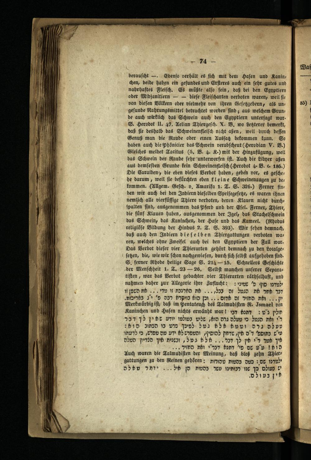 berauscht. Ebenso verhält es sich mit dem Hasen und Kaninchen, beide haben ein gesundes und Ersteres auch ein sehr gutes und nahrhaftes Fleisch. Es müßte also sein, daß bei den Egyptiern oder Midjanitiern diese Fleischarten verboten waren, weil sie