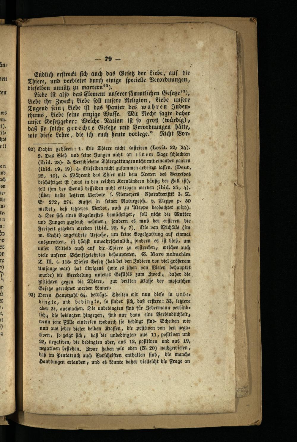 272, 274. Russel in seiner Naturgesch. v. Aleppo p. 50 meldet, daß lehteres Verbot, auch zu' Aleppo beobachtet wird). 4. Der sich eines Vogelnestes bemächtiget, soll nicht die Mutter und Jungen zugleich nehmen; sondern es muß der ersteren die Freiheit gegeben werden( ibid. 22. 6, 7). Die von Michalis( im m. Recht) angeführte Ursache, um keine Vogelgattung auf einmal auszurotten, ist höchst unwahrscheinlich; sondern es ist bloß, um unser Mitleid auch auf die Thiere zu erstrecken, welches auch viele unserer Schriftgelehrten behaupteten. S. More nebuchim 2. Ill. c. 118. Dieses Gesez( das bei den Indiern von viel größerem Umfange war) hat übrigens( wie es schon von Vielen behauptet wurde) die Veredelung unseres Gefühls zum Zweck; daher die Pflichten gegen die Thiere, zur dritten Klasse der mosaischen Geseze gerechnet werden können.