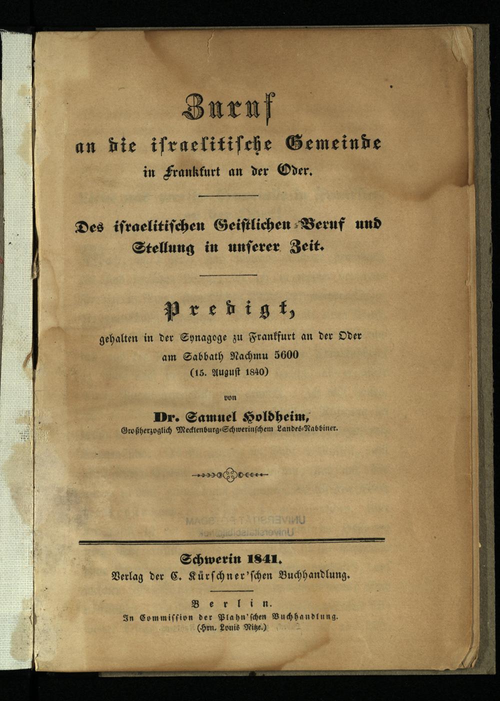 gehalten in der Synagoge zu Frankfurt an der Oder am Sabbath Nachmu 5600 (15. August 1840)