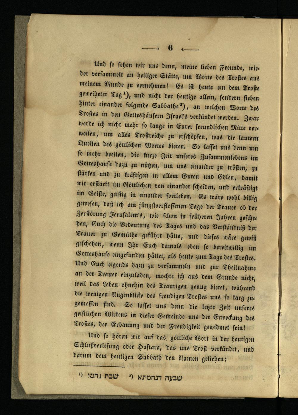 Und so sehen wir uns denn, meine lieben Freunde, wieder versammelt an heiliger Stätte, um Worte des Trostes aus meinem Munde zu vernehmen! Es ist heute ein dem Troste geweiheter Tag 1), und nicht der heutige allein, sondern sieben hinter einander folgende Sabbathe 2), an welchen Worte des Trostes in den Gotteshäusern Israel's verkündet werden. Zwar werde ich nicht mehr so lange in Eurer freundlichen Mitte verweilen, um alles Trostreiche zu erschöpfen, was die lautern Quellen des göttlichen Wortes bieten. So lasset uns denn um so mehr beeilen, die kurze Zeit unseres Zusammenlebens im Gotteshause dazu zu nützen, um uns einander zu trösten, zu stärken und zu kräftigen in allem Guten und Edlen, damit wir erstarkt im Göttlichen von einander scheiden, und erkräftigt im Geiste, geistig in einander fortleben. Es wäre wohl billig gewesen, daß ich am jüngstverflossenen Tage der Trauer ob der Zerstörung Jerusalem's, wie schon in früheren Jahren geschehen, Euch die Bedeutung des Tages und das Verständniß der Trauer zu Gemüthe geführt hätte, und dieses wäre gewiß geschehen, wenn Ihr Euch damals eben so bereitwillig im Gotteshause eingefunden hättet, als heute zum Tage des Trostes. Und Euch eigends dazu zu versammeln und zur Theilnahme an der Trauer einzuladen, mochte ich aus dem Grunde nicht, weil das Leben ohnehin des Traurigen genug bietet, während die wenigen Augenblicke des freudigen Trostes uns so karg zu- gemessen sind. So lasset uns denn die letzte Zeit unseres geistlichen Wirkens in dieser Gemeinde uns der Erweckung des Trostes, der Erbauung und der Freudigkeit gewidmet sein!