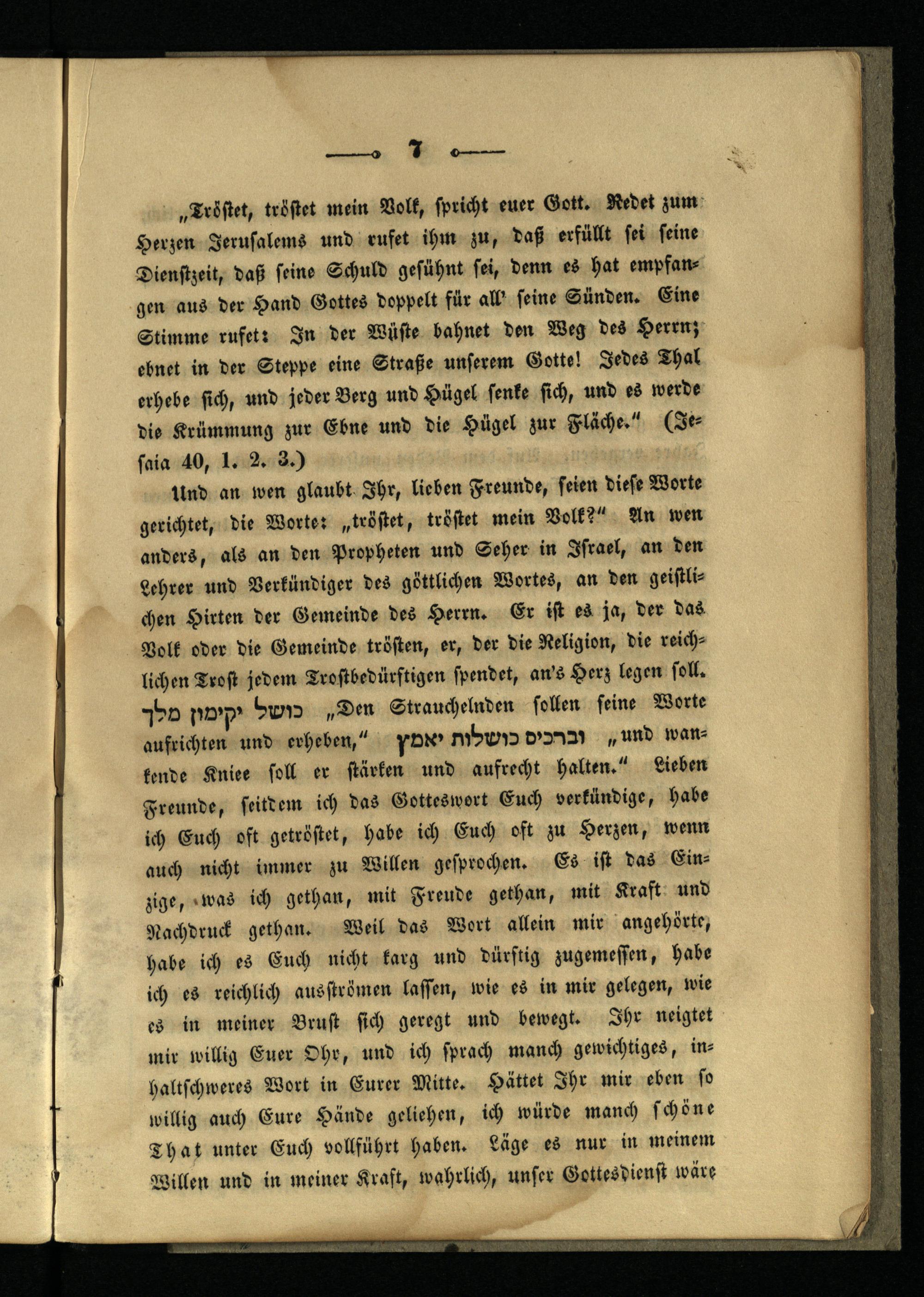 „Tröstet, tröstet mein Volk, spricht euer Gott. Redet zum Herzen Jerusalems und rufet ihm zu, daß erfüllt sei seine Dienstzeit, daß seine Schuld gesühnt sei, denn es hat empfangen aus der Hand Gottes doppelt für all' seine Sünden. Eine Stimme rufet: In der Wüste bahnet den Weg des Herrn; ebnet in der Steppe eine Straße unserem Gotte! Jedes Thal erhebe sich, und jeder Verg und Hügel senke sich, und es werde die Krümmung zur Ebne und die Hügel zur Fläche." (Je- saia 40, 1. 2. 3.)