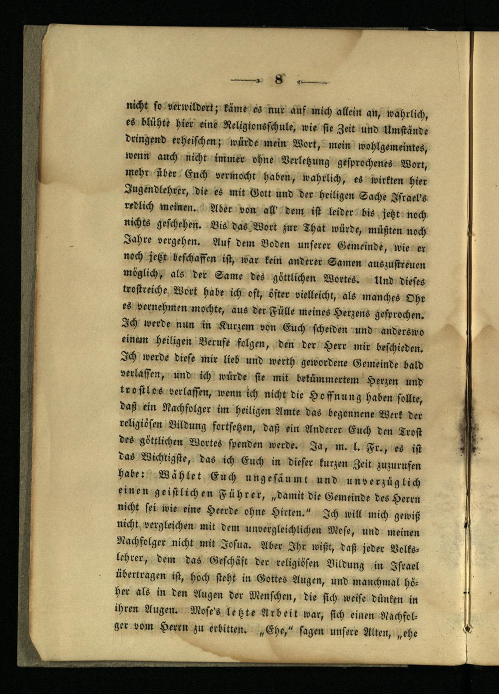 nicht so verwildert; käme es nur auf mich allein an, wahrlich, es blühte hier eine Religionsschule, wie sie Zeit und Umstände dringend erheischen; würde mein Wort, mein wohlgemeintes, wenn auch nicht immer ohne Verletzung gesprochenes Wort, mehr über Euch vermocht haben, wahrlich, es wirkten hier Jugendlehrer, die es mit Gott und der heiligen Sache Israel's redlich meinen. Aber von all' dem ist leider bis jetzt noch nichts geschehen. Bis das Wort zur That würde, müßten noch Jahre vergehen. Auf dem Boden unserer Gemeinde, wie er noch jetzt beschaffen ist, war kein anderer Samen auszustreuen möglich, als der Same des göttlichen Wortes. Und dieses trostreiche Wort habe ich oft, öfter vielleicht, als manches Ohr es vernehmen mochte, aus der Fülle meines Herzens gesprochen. Ich werde nun in Kurzem von Euch scheiden und anderswo einain heiligen Berufe folgen, den der Herr mir beschieden. Ich werde diese mir lieb und werth gewordene Gemeinde bald verlassen, und ich würde sie mit bekümmertem Herzen und trostlos verlassen, wenn ich nicht die Hoffnung haben sollte, daß ein Nachfolger im heiligen Amte das begonnene Werk der religiösen Bildung fortsetzen, daß ein Anderer Euch den Trost des göttlichen Wortes spenden werde. Ja, m. l. Fr., es ist das Wichtigste, das ich Euch in dieser kurzen Zeit zuzurufen habe: Wählet Euch ungesäumt und unverzüglich einen geistlichen Führer, „damit die Gemeinde des Herrn nicht sei wie eine Heerde ohne Hirten." Ich will mich gewiß nicht vergleichen mit dem unvergleichlichen Mose, und meinen Nachfolger nicht mit Josua. Aber Ihr wißt, daß jeder Vclks- lehrer, dem das Geschäft der religiösen Bildung in Israel übertragen ist, hoch steht in Gottes Augen, und manchmal höher als in den Augen der Menschen, die sich weise dünken in ihren Augen. Mose's letzte Arbeit war, sich einen Nachfolger vom Herrn zu erbitten. „Ehe," sagen unsere Alten, „ehe