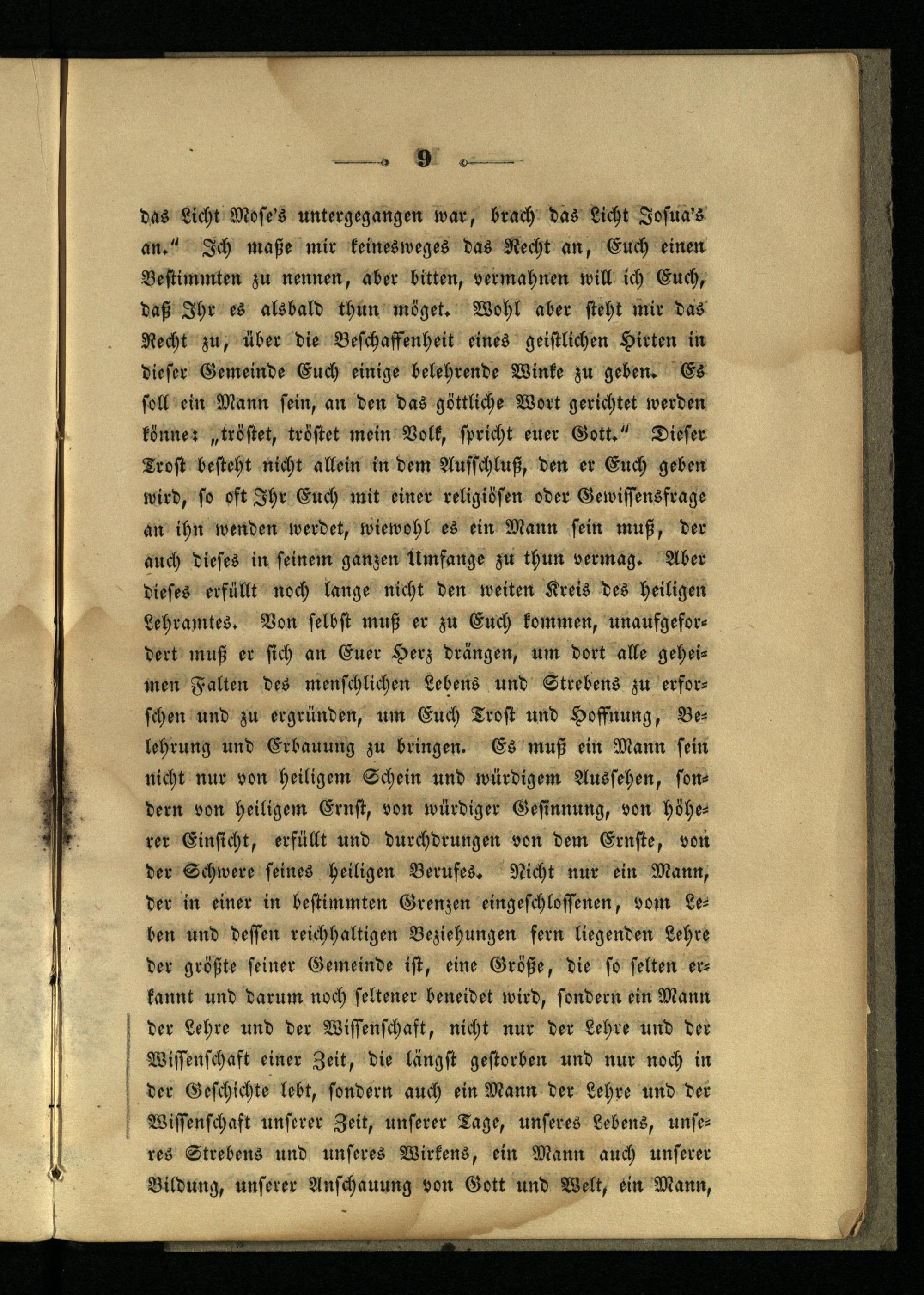 das Licht Mose's untergegangen war, brach das Licht Josua's an." Ich maße mir keinesweges das Recht an, Euch einen Bestimmten zu nennen, aber bitten, vermahnen will ich Euch, daß Ihr es alsbald thun möget. Wohl aber steht mir das Recht zu, über die Beschaffenheit eines geistlichen Hirten in dieser Gemeinde Euch einige belehrende Winke zu geben. Es soll ein Mann sein, an den das göttliche Wort gerichtet werden könne: „tröstet, tröstet mein Volk, spricht euer Gott." Dieser Trost besteht nicht allein in dem Ausschluß, den er Euch geben wird, so oft Ihr Euch mit einer religiösen oder Gewissensfrage an ihn wenden werdet, wiewohl es ein Mann sein muß, der auch dieses in seinem ganzen Umfange zu thun vermag. Aber dieses erfüllt noch lange nicht den weiten Kreis des heiligen Lehramtes. Von selbst muß er zu Euch kommen, unaufgefordert muß er sich an Euer Herz drängen, um dort alle geheimen Falten des menschlichen Lebens und Strebens zu erforschen und zu ergründen, um Euch Trost und Hoffnung, Belehrung und Erbauung zu bringen. Es muß ein Mann sein nicht nur von heiligem Schein und würdigem Aussehen, sondern von heiligem Ernst, von würdiger Gesinnung, von höherer Einsicht, erfüllt und durchdrungen von dem Ernste, von der Schwere seines heiligen Berufes. Nicht nur ein Mann, der in einer in bestimmten Grenzen eingeschlossenen, vom Leben und dessen reichhaltigen Beziehungen fern liegenden Lehre der größte seiner Gemeinde ist, eine Größe, die so selten erkannt und darum noch seltener beneidet wird, sondern ein Mann ? der Lehre und der Wissenschaft, nicht nur der Lehre und der Wissenschaft einer Zeit, die längst gestorben und nur noch in der Geschichte lebt, sondern auch ein Mann der Lehre und der Wissenschaft unserer Zeit, unserer Tage, unseres Lebens, unseres Strebens und unseres Wirkens, ein Mann auch unserer Bildung, unserer Anschauung von Gott und Welt, ein Mann,