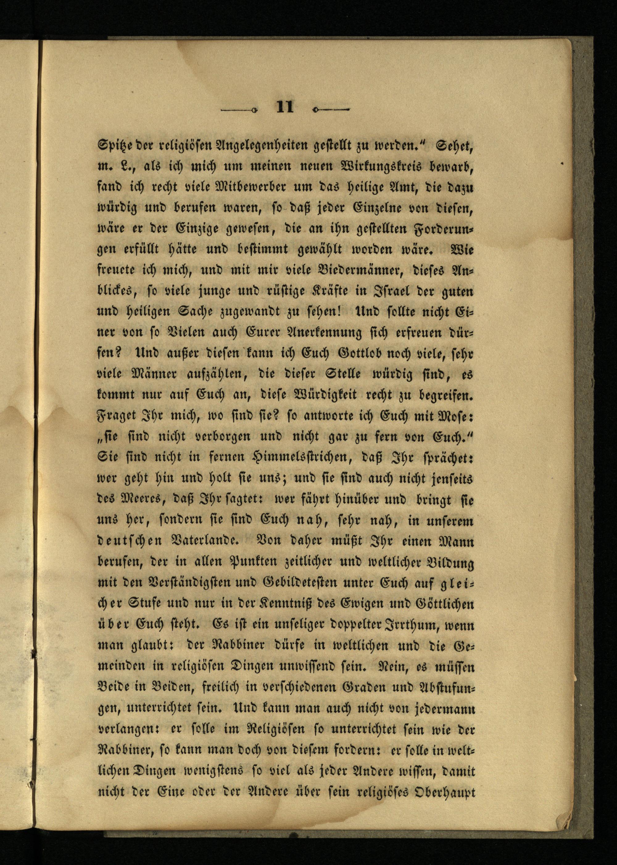 Spitze der religiösen Angelegenheiten gestellt zu werden." Sehet, m. L., als ich mich um meinen neuen Wirkungskreis bewarb, fand ich recht viele Mitbewerber um das heilige Amt, die dazu würdig und berufen waren, so daß jeder Einzelne von diesen, wäre er der Einzige gewesen, die an ihn gestellten Forderungen erfüllt hätte und bestimmt gewählt worden wäre. Wie freucte ich mich, und mit mir viele Biedermänner, dieses Anblickes, so viele junge und rüstige Kräfte in Israel der guten und heiligen Sache zugewandt zu sehen! Und sollte nicht Einer von so Vielen auch Eurer Anerkennung sich erfreuen dürfen? Und außer diesen kann ich Euch Gottlob noch viele, sehr viele Männer aufzählen, die dieser Stelle würdig sind, es kommt nur auf Euch an, diese Würdigkeit recht zu begreifen. Fraget Ihr mich, wo sind sie? so antworte ich Euch mit Moser „sie sind nicht verborgen und nicht gar zu fern von Euch." Sie sind nicht in fernen Himmelsstrichen, daß Ihr sprächet; wer geht hin und holt sie uns; und sie sind auch nicht jenseits des Meeres, daß Ihr sagtet; wer fährt hinüber und bringt sie uns her, sondern sie sind Euch nah, sehr nah, in unserem deutschen Vaterlande. Von daher müßt Ihr einen Mann berufen, der in allen Punkten zeitlicher und weltlicher Bildung mit den Verständigsten und Gebildetesten unter Euch auf gleicher Stufe und nur in der Kenntniß des Ewigen und Göttlichen über Euch steht. Es ist ein unseliger doppelter Jrrthum, wenn man glaubt: der Rabbiner dürfe in weltlichen und die Gemeinden in religiösen Dingen unwissend sein. Nein, es müssen Beide in Beiden, freilich in verschiedenen Graden und Abstufungen, unterrichtet sein. Und kann man auch nicht von jedermann verlangen; er solle im Religiösen so unterrichtet sein wie der Rabbiner, so kann man doch von diesem fordern: er solle in weltlichen Dingen wenigstens so viel als jeder Andere wissen, damit nicht der Eine oder der Andere über sein religiöses Oberhaupt