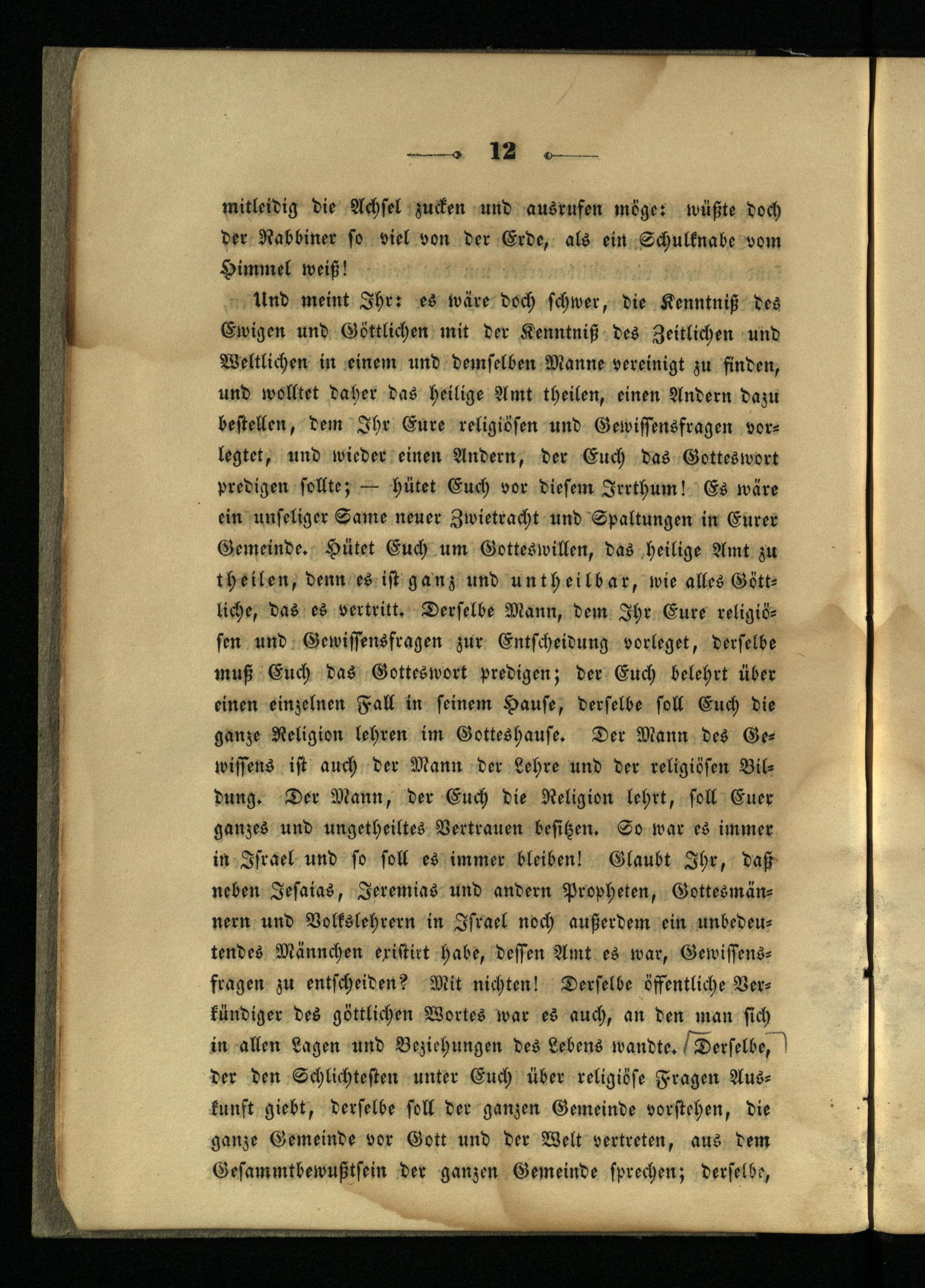 Und meint Ihr: es wäre doch schwer, die Kenntniß des Ewigen und Göttlichen mit der Kenntniß des Zeitlichen und Weltlichen in einem und demselben Manne vereinigt zu finden, und wolltet daher das heilige Amt theilen, einen Andern dazu bestellen, dem Ihr Eure religiösen und Gewissensfragen vorlegtet, und wieder einen Andern, der Euch das Gctteswort predigen sollte; — hütet Euch vor diesem Jrrthum! Es wäre ein unseliger Same neuer Zwietracht und Spaltungen in Eurer Gemeinde. Hütet Euch um Gotteswillcn, das heilige Amt zu theilen, denn es ist ganz und unth eilbar, wie alles Göttliche, das es vertritt. Derselbe Mann, dem Ihr Eure religiösen und Gcwissenssragen zur Entscheidung vorleget, derselbe muß Euch das Gotteswort predigen; der Euch belehrt über einen einzelnen Fall in seinem Hause, derselbe soll Euch die ganze Religion lehren im Gotteshause. Der Mann des Gewissens ist auch der Mann der Lehre und der religiösen Bildung. Der Mann, der Euch die Religion lehrt, soll Euer ganzes und ungetheiltes Vertrauen besitzen. So war es immer in Israel und so soll es immer bleiben! Glaubt Ihr, daß neben Jesaias, Jeremias und andern Propheten, Gottesmännern und Volkslehrern in Israel noch außerdem ein unbedeutendes Männchen existirt habe, dessen Amt es war, Gewissensfragen zu entscheiden? Mit Nichten! Derselbe öffentliche Verkündiger des göttlichen Wortes war es auch, an den man sich in allen Lagen und Beziehungen des Lebens wandte. /Derselbe^ der den Schlichtesten unter Euch über religiöse Fragen Auskunft giebt, derselbe soll der ganzen Gemeinde vorstehen, die ganze Gemeinde vor Gott und der Welt vertreten, aus dem Gesammtbewußtsein der ganzen Gemeinde sprechen; derselbe,