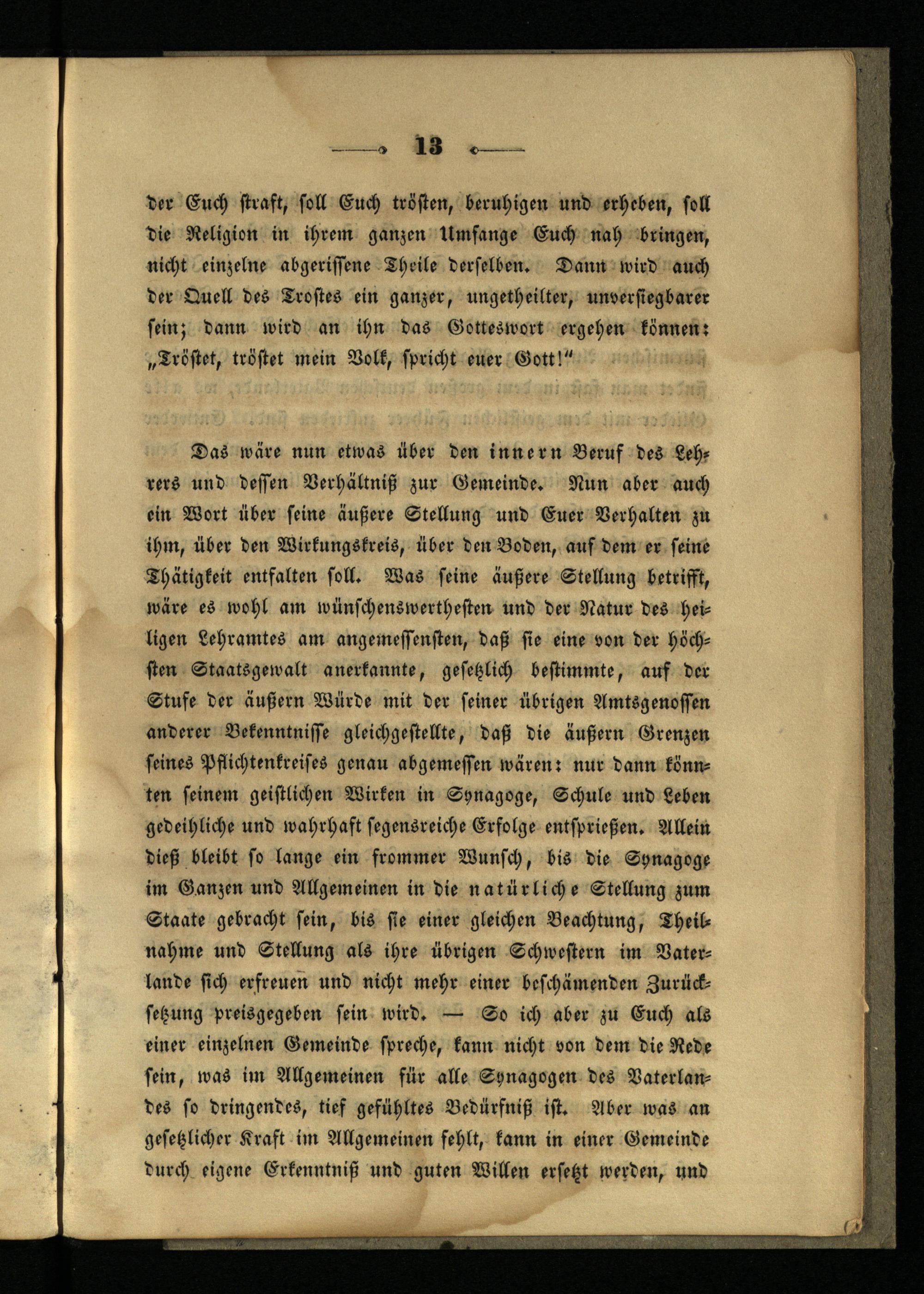 Das wäre nun etwas über den innern Beruf des Lehrers und dessen Verhältnis! zur Gemeinde. Nun aber auch ein Wort über seine äußere Stellung und Euer Verhalten zu ihm, über den Wirkungskreis, über den Boden, aus dem er seine Thätigkeit entfalten soll. Was seine äußere Stellung betrifft, wäre es wohl am wünschenswerthesten und der Natur des heiligen Lehramtes am angemessensten, daß sie eine von der höchsten Staatsgewalt anerkannte, gesetzlich bestimmte, auf der Stufe der äußern Würde mit der seiner übrigen Amtsgenossen anderer Bekenntnisse gleichgestellte, daß die äußern Grenzen seines Pflichtenkreises genau abgemessen wären: nur dann könnten seinem geistlichen Wirken in Synagoge, Schule und Leben gedeihliche und wahrhaft segensreiche Erfolge entsprießen. Allein Ließ bleibt so lange ein frommer Wunsch, bis die Synagoge im Ganzen und Allgemeinen in die natürliche Stellung zum Staate gebracht sein, bis sie einer gleichen Beachtung, Theil- nahme und Stellung als ihre übrigen Schwestern im Vaterlande sich erfreuen und nicht mehr einer beschämenden Zurücksetzung preisgegeben sein wird. — So ich aber zu Euch als einer einzelnen Gemeinde spreche, kann nicht von dem die Rede sein, was im Allgemeinen für alle Synagogen des Vaterlandes so dringendes, tief gefühltes Bedürfniß ist. Aber was au gesetzlicher Kraft im Allgemeinen fehlt, kann in einer Gemeinde durch eigene Erkenntnis! und guten Willen ersetzt werden, und