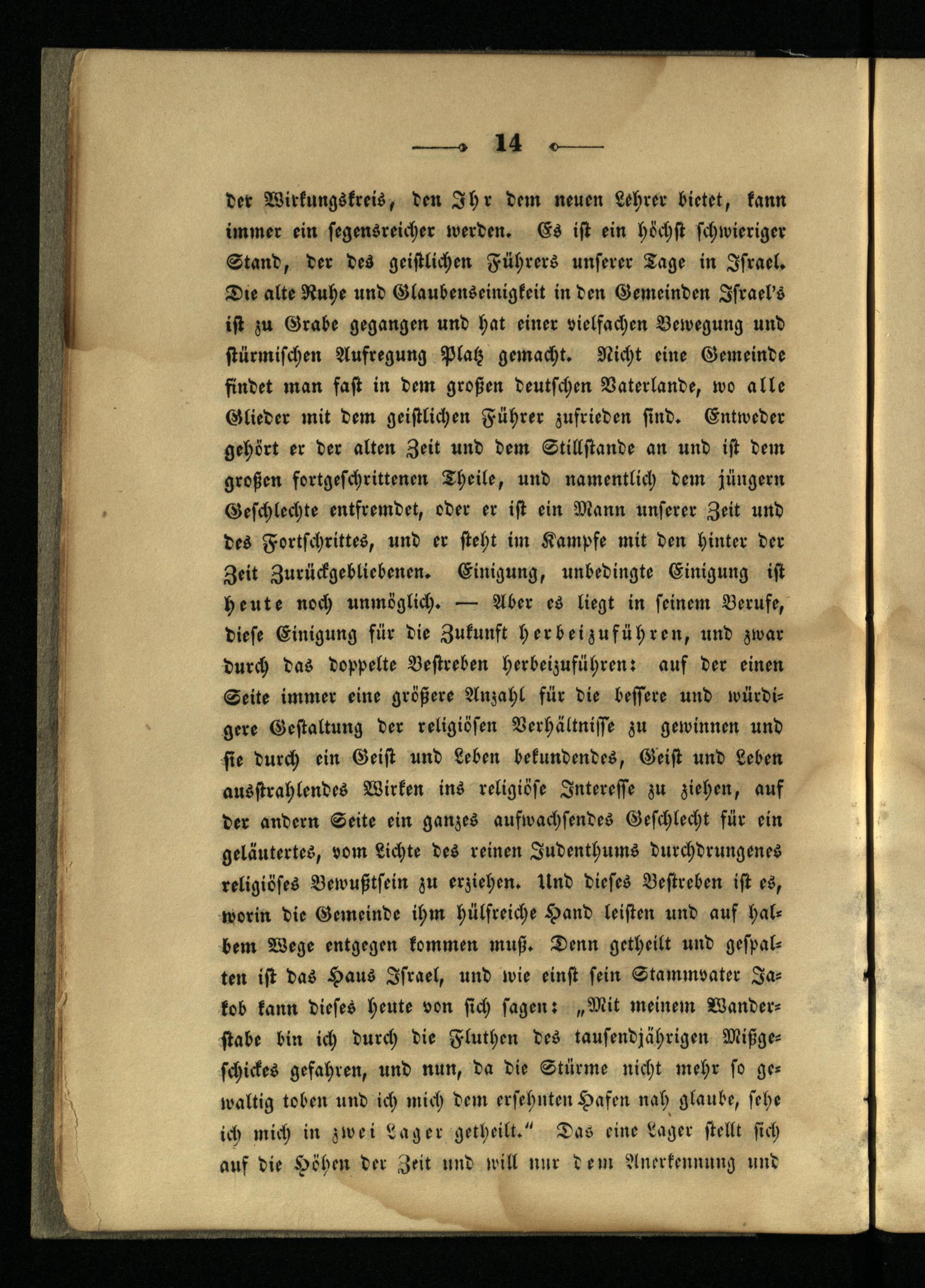 der Wirkungskreis, den Ihr dem neuen Lehrer bietet, kann immer ein segensreicher werden. Es ist ein höchst schwieriger Stand, der des geistlichen Führers unserer Tage in Israel. Dre alte Ruhe und Glaubenseinigkcit in den Gemeinden Jsrael's ist zu Grabe gegangen und hat einer vielfachen Bewegung und stürmischen Aufregung Platz gemacht. Nicht eine Gemeinde findet man fast in dem großen deutschen Vaterlande, wo alle Glieder mit dem geistlichen Führer zufrieden sind. Entweder gehört er der alten Zeit und dem Stillstände an und ist dem großen fortgeschrittenen Theile, und namentlich dem jünger» Geschlechts entfremdet, oder er ist ein Mann unserer Zeit und des Fortschrittes, und er steht im Kampfe mit den hinter der Zeit Zurückgebliebenen. Einigung, unbedingte Einigung ist heute noch unmöglich. — Aber es liegt in seinem Berufe, diese Einigung für die Zukunft herbeizuführen, und zwar durch das doppelte Bestreben herbeizuführen r aus der einen Seite immer eine größere Anzahl für die bessere und würdigere Gestaltung der religiösen Verhältnisse zu gewinnen und sie durch ein Geist und Leben bekundendes, Geist und Leben ausstrahlendes Wirken ins religiöse Interesse zu ziehen, auf der andern Seite ein ganzes aufwachsendes Geschlecht für ein geläutertes, vom Lichte des reinen Judenthums durchdrungenes religiöses Bewußtsein zu erziehen. Und dieses Bestreben ist es, worin die Gemeinde ihm hülsreiche Hand leisten und aus halbem Wege entgegen kommen muß. Denn getheilt und gespalten ist das Haus Israel, und wie einst sein Stammvater Jakob kann dieses heute von sich sagen r „Mit meinem Wanderstabe bin ich durch die Fluthcn des tausendjährigen Mißgeschickes gefahren, und nun, da die Stürme nicht mehr so gewaltig toben und ich mich dem ersehnten Hafen nah glaube, sehe ich mich in zwei Lager getheilt." Das eine Lager stellt sich auf die Höhen der Zeit und will nur dem Anerkennung und