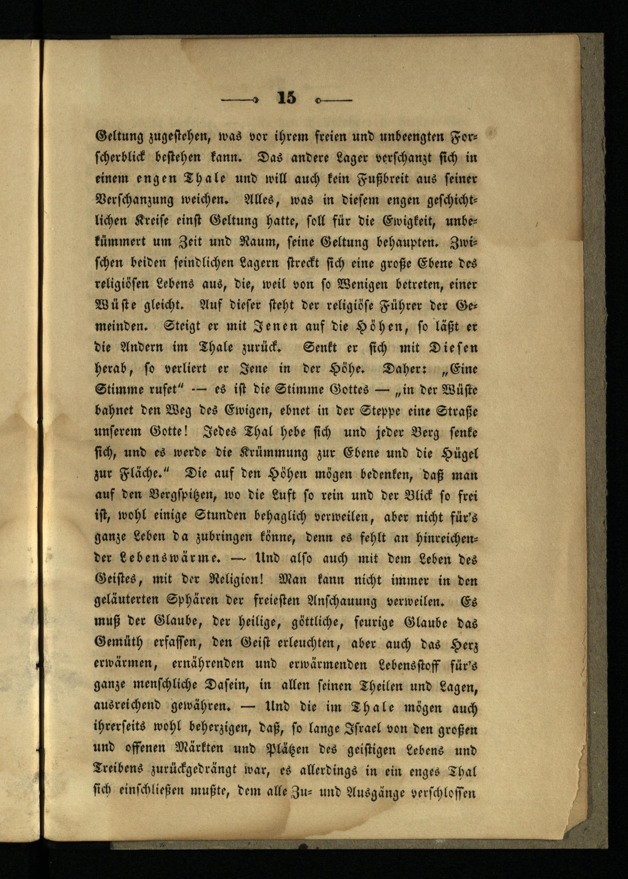 Geltung zugestehen, was vor ihrem freien und unbeengten Forscherblick bestehen kann. Das andere Lager verschanzt sich in einem engen Thale und will auch kein Fußbreit aus seiner Verschanzung weichen. Alles, was in diesem engen geschichtlichen Kreise einst Geltung hatte, soll für die Ewigkeit, unbekümmert um Zeit und Raum, seine Geltung behaupten. Zwischen beiden feindlichen Lagern streckt sich eine große Ebene des religiösen Lebens aus, die, weil von so Wenigen betreten, einer Wüste gleicht. Auf dieser steht der religiöse Führer der Gemeinden. Steigt er mit Jenen auf die Höhen, so läßt er die Andern im Thale zurück. Senkt er sich mit Diesen herab, so verliert er Jene in der Höhe. Daher: „Eine Stimme rufet" — es ist die Stimme Gottes — „in der Wüste bahnet den Weg des Ewigen, ebnet in der Steppe eine Straße unserem Gotte! Jedes Thal hebe sich und jeder Verg senke sich, und es werde die Krümmung zur Ebene und die Hügel zur Fläche." Die auf den Höhen mögen bedenken, daß man auf den Vergspitzen, wo die Luft so rein und der Blick so frei ist, wohl einige Stunden behaglich verweilen, aber nicht für's ganze Leben da zubringen könne, denn es fehlt an hinreichender Lebens wärme. — Und also auch mit dem Leben des Geistes, mit der Religion! Man kann nicht immer in den geläuterten Sphären der freiesten Anschauung verweilen. Es muß der Glaube, der heilige, göttliche, feurige Glaube das Gemüth erfassen, den Geist erleuchten, aber auch das Herz erwärmen, ernährenden und erwärmenden Lebensstoff für's ganze menschliche Dasein, in allen seinen Theilen und Lagen, ausreichend gewähren. — Und die im Thale mögen auch ihrerseits wohl beherzigen, daß, so lange Israel von den großen und offenen Märkten und Plätzen des geistigen Lebens und Treibens zurückgedrängt war, es allerdings in ein enges Thal sich einschließen mußte, denk alte Zu- und Ausgänge verschlossen