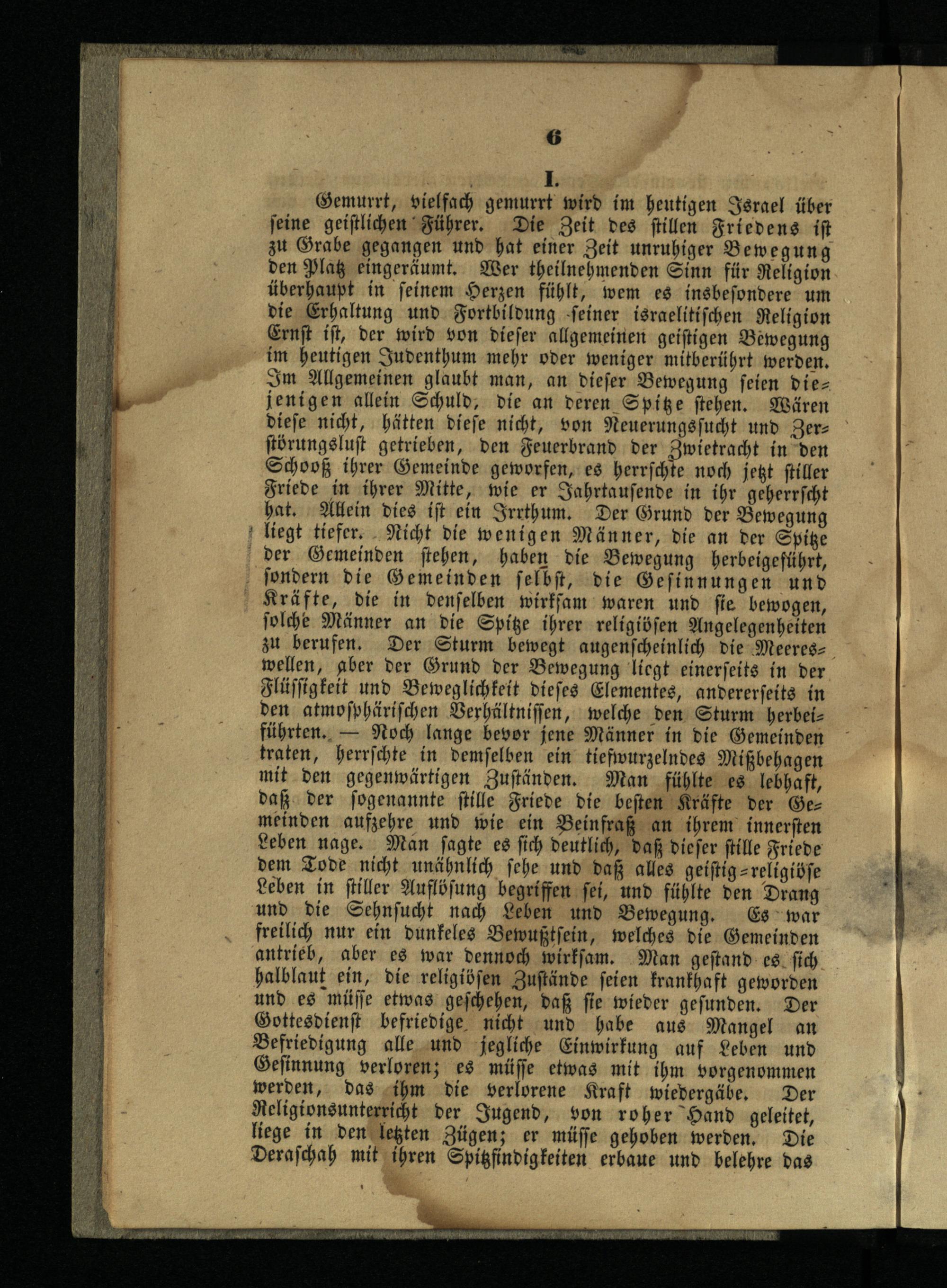 zu Grabe gegangen und hat einer Zeit unruhiger Bewegung den Platz eingeräumt. Wer theilnehmenden Sinn für Religion überhaupt in ſeinem Herzen fühlt, wem es insbeſondere um die Erhaltung und Fortbildung feiner israelitiſchen Religion Ernſt iſt, der wird von dieſer allgemeinen geiſtigen Bewegung im heutigen Judenthum mehr oder weniger mitberührt werden. Im Allgemeinen glaubt man, an dieſer Bewegung ſeien Dies jenigen allein Schuld, die an deren Spitze ſtehen. Wären dieſe nicht, hätten dieſe nicht, von Neuerungsſucht und Zerſtörungsluſt getrieben, den Feuerbrand der Zwietracht in den Schooß ihrer Gemeinde geworfen, es herrſchke noch jetzt ſtiller Friede in ihrer Mitte, wie er Jahrtauſende in ihr geherrſcht hat. Allein dies iſt ein Irrthum. Der Grund der Bewegung liegt tiefer. Nicht die wenigen Männer, die an der Spitze der Gemeinden ſtehen, haben die Bewegung herbeigeführt, ſondern die Gemeinden ſelbſt, die Geſinnungen und Kräfte, die in denſelben wirkſam waren und ſie bewogen, ſolche Männer an die Spitze ihrer religiöſen Angelegenheiten zu berufen. Der Sturm bewegt augenſcheinlich die Meereswellen, aber der Grund der Bewegung liegt einerſeits in der Flüſſigkeit und Beweglichkeit dieſes Elementes, andererſeits in den atmoſphäriſchen Verhültniſſen, welche den Sturm herbeiführten.— Noch lange bevor jene Männer in die Gemeinden traten, herrſchte in demſelben ein tiefwurzelndes Mißbehagen mit den gegenwärtigen Zuſtänden. Man fühlte es lebhaft, daß der ſogenannte ſtille Friede die beſten Kräfte der Gez meinden aufzehre und wie ein Beinfraß an ihrem innerſten Leben nage. Man ſagte es ſich deutlich, daß dieſer ſtille Friede dem Tode nicht unähnlich ſehe und daß alles geiſtig⸗religiſe Leben in ſtiller Auflöſung begriffen ſei, und fühlte den Drang und die Sehnſucht nach Leben und Bewegung. Es war freilich nur ein dunkeles Bewußtſein, welches die Gemeinden antrieb, aber es war dennoch wirkſam. Man geſtand es ſich halblaut ein, die religiöſen Zuſtände ſeien krankhaft geworden und es müſſe etwas geſchehen, daß ſie wieder geſunden. Der Gottesdienſt befriedige nicht und habe aus Mangel an Befriedigung alle und jegliche Einwirkung auf Leben und Geſinnung verloren; es müſſe etwas mit ihm vorgenommen werden, das ihm die verlorene Kraft wiedergähe. Der Religionsunterricht der Jugend, von roher Hand geleitet, liege in den letzten Zügen; er müſſe gehoben werden. Die Deraſchah mit ihren Spitzfindigkeiten erbaue und belehre das