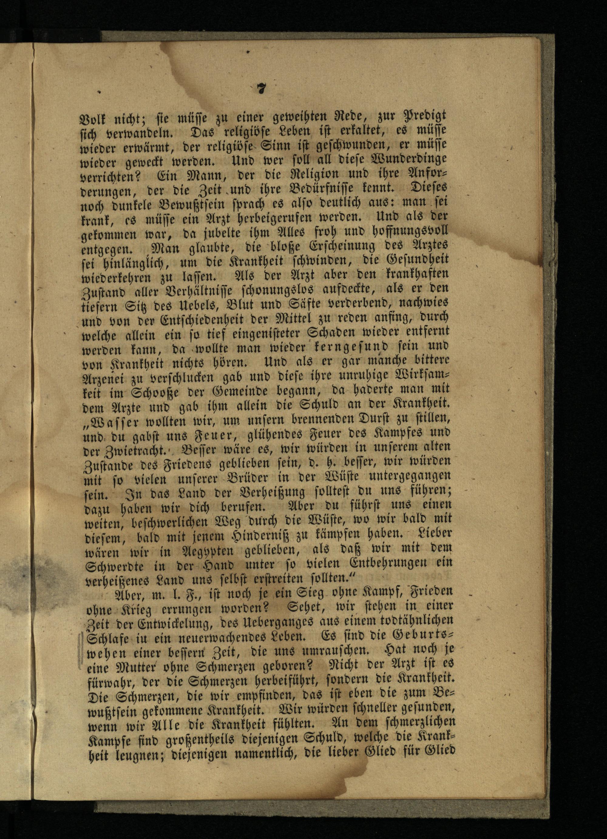 Volk nicht; fie müſſe zu einer geweihten Rede, zur Predigt ſich verwandeln. Das religibſe Leben iſt erkaltet, es müſſe wieder erwärmt, der religiöſe Sinn iſt geſchwunden, er müſſe wieder geweckt werden. Und wer ſoll all dieſe Wunderdinge verrichten? Ein Mann, der die Religion und ihre Anforderungen, der die Zeit und ihre Bedürfniſſe kennt. Dieſes noch dunkele Bewußtſein ſprach es alſo deutlich aus: man ſei krank, es müſſe ein Arzt herbeigerufen werden. Und als der gekommen war, da jubelte ihm Alles froh und hoffnungsvoll entgegen. Man glaubte, die bloße Erſcheinung des Arztes ſei hinlänglich, um die Krankheit ſchwinden, die Geſundheit wiederkehren zu laſſen. Als der Arzt aber den krankhaften Zuſtand aller Verhältniſſe ſchonungslos aufdeckte, als er den tiefern Sitz des Uebels, Blut und Säfte verderbend, nachwies