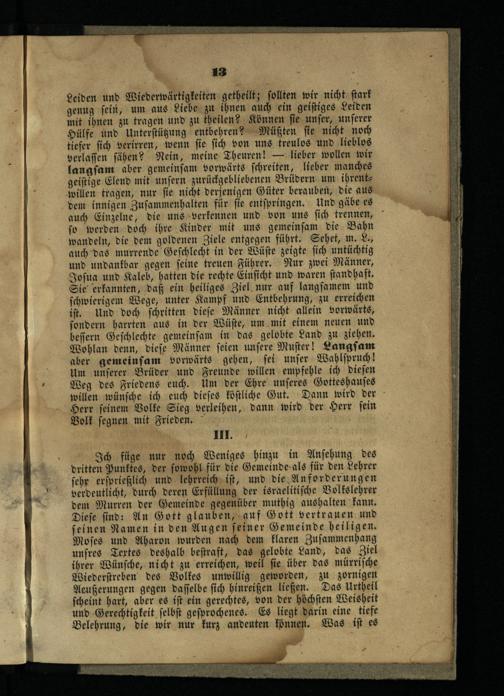 Leiden und Wiederwärtigkeiten getheilt; ſollten wir nicht ſtark genug ſein, um aus Liebe zu ihnen auch ein geiſtiges Leiden mit ihnen zu tragen und zu theilen? Können ſie unſer, unſerer Hülfe und Unterſtützung entbehren? Müßten ſie nicht noch tiefer ſich verirren, wenn ſie ſich von uns treulos und lieblos verlaſſen ſähen? Nein, meine Theuren!— lieber wollen wir langſam aber gemeinſam vorwärts ſchreiten, lieber manches geiſtige Elend mit unſern zurückgebliebenen Brüdern um ihrentwillen tragen, nur ſie nicht derſenigen Güter berauben, die aus dem innigen Zuſammenhalten für ſie entſpringen. Und gäbe es auch Einzelne, die uns verkennen und von uns ſich trennen, ſo werden doch ihre Kinder mit uns gemein ſam die Bahn wandeln, die dem goldenen Ziele entgegen führt. Sehet, m. Nr auch das murrende Geſchlecht in der Wüſte zeigte ſich untüchtig und undankbar gegen ſeine treuen Führer. Nur zwei Männer, Joſug und Kaleb, hatten die rechte Einſicht und waren ſtandhaft. Sie erkannten, daß ein heiliges Ziel nur auf langſamem und ſchwierigem Wege, unter Kampf und Entbehrung, zu erreichen iſt. Und doch ſchritten dieſe Männer nicht allein vorwärts, ſondern harrten aus in der Wüſte, um mit einem neuen und beſſern Geſchlechte gemeinſam in das gelobte Land zu ziehen. Wohlan denn, dieſe Männer ſeien unſere Muſter! Langſam aber gemeinſam vorwärts gehen, ſei unſer Wahlſpruch! Um unſerer Brüder und Freunde willen empfehle ich dieſen Weg des Friedens euch. Um der Ehre uuſeres Gotteshauſes willen wünſche ich euch dieſes köſtliche Gut. Dann wird der Herr ſeinem Volke Sieg verleihen, dann wird der Herr ſein Volk fegnen mit Frieden.
