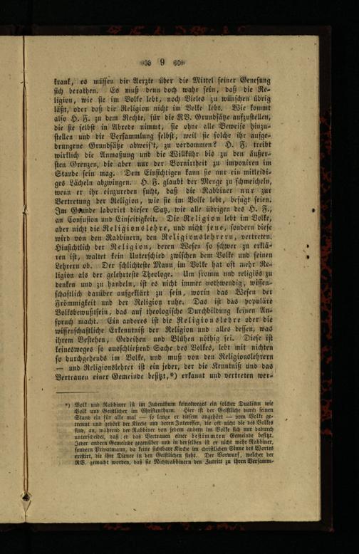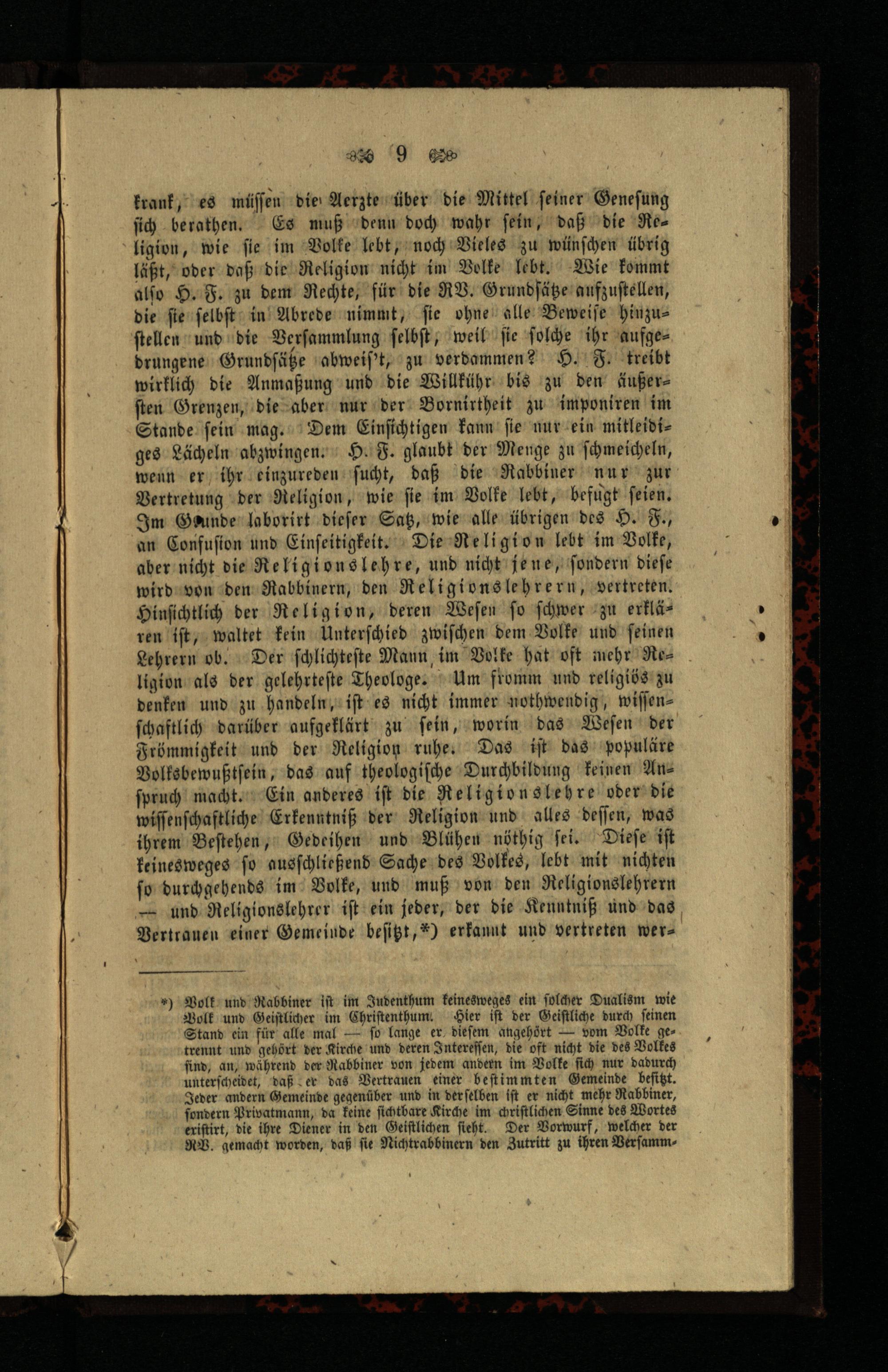krank, es müſſen die Aerzte über die Mittel ſeiner Geneſung ſich berathen. Es muß denn doch wahr fein, daß die Religion, wie ſie im Volke lebt, noch Vieles zu wünſchen übrig läßt, oder daß die Religion nicht im Volle lebt. Wie kommt alſo H. F. zu dem Rechte, für die RV. Grundſätze aufzuſtellen, die ſie ſelbſt in Abrede nimmt, ſie ohne alle Beweiſe hinzuſtellen und die Verſammlung ſelbſt, weil ſie ſolche ihr aufgedrungene Grundſätze abweiſt, zu verdammen? H. F. treibt wirklich die Anmaßung und die Willkühr bis zu den äußerſten Grenzen, die aber nur der Bornirtheit zu imponiren im Stande ſein mag. Dem Einſichtigen kann ſie nur ein mitleidiges Lächeln abzwingen. H. F. glaubt der Menge zu ſchmeicheln, wenn er ihr einzureden ſucht, daß die Rabbiner nur zur Vertretung der Religion, wie ſie im Volke lebt, befugt ſeien. Im Gaunde laborirt dieſer Satz, wie alle übrigen des H. F., an Confuſion und Einſeitigkeit. Die Religion lebt im Volke, aber nicht die Religionslehre, und nicht je ne, ſondern dieſe wird von den Rabbinern, den Religions lehrern, vertreten. Hinſichtlich der Religion, deren Weſen ſo ſchwer zu erklären iſt, waltet kein Unterſchied zwiſchen dem Volke und ſeinen Lehrern ob. Der ſchlichteſte Mann im Volke hat oft mehr Religion als der gelehrteſte Theologe. Um fromm und religiös zu denken und zu handeln, iſt es nicht immer nothwendig, wiſſenſchaftlich darüber aufgeklärt zu ſein, worin das Weſen der Frömmigkeit und der Religion ruhe. Das iſt das populäre Vollsbewußtſein, das auf theologiſche Durchbildung keinen Ans ſpruch macht. Ein anderes iſt die Religionslehre oder die wiſſenſchaftliche Erkenntniß der Religion und alles deſſen, was ihrem Beſtehen, Gedeihen und Blühen nöthig ſei. Dieſe iſt keinesweges ſo ausſchließend Sache des Volkes, lebt mit nichten fo durchgehends im Volke, und, muß von den Religionslehrern — und Religionslehrer iſt ein jeder, der die Kenntniß und das Vertrauen einer Gemeinde beſitzt,s) erkannt und vertreten wer