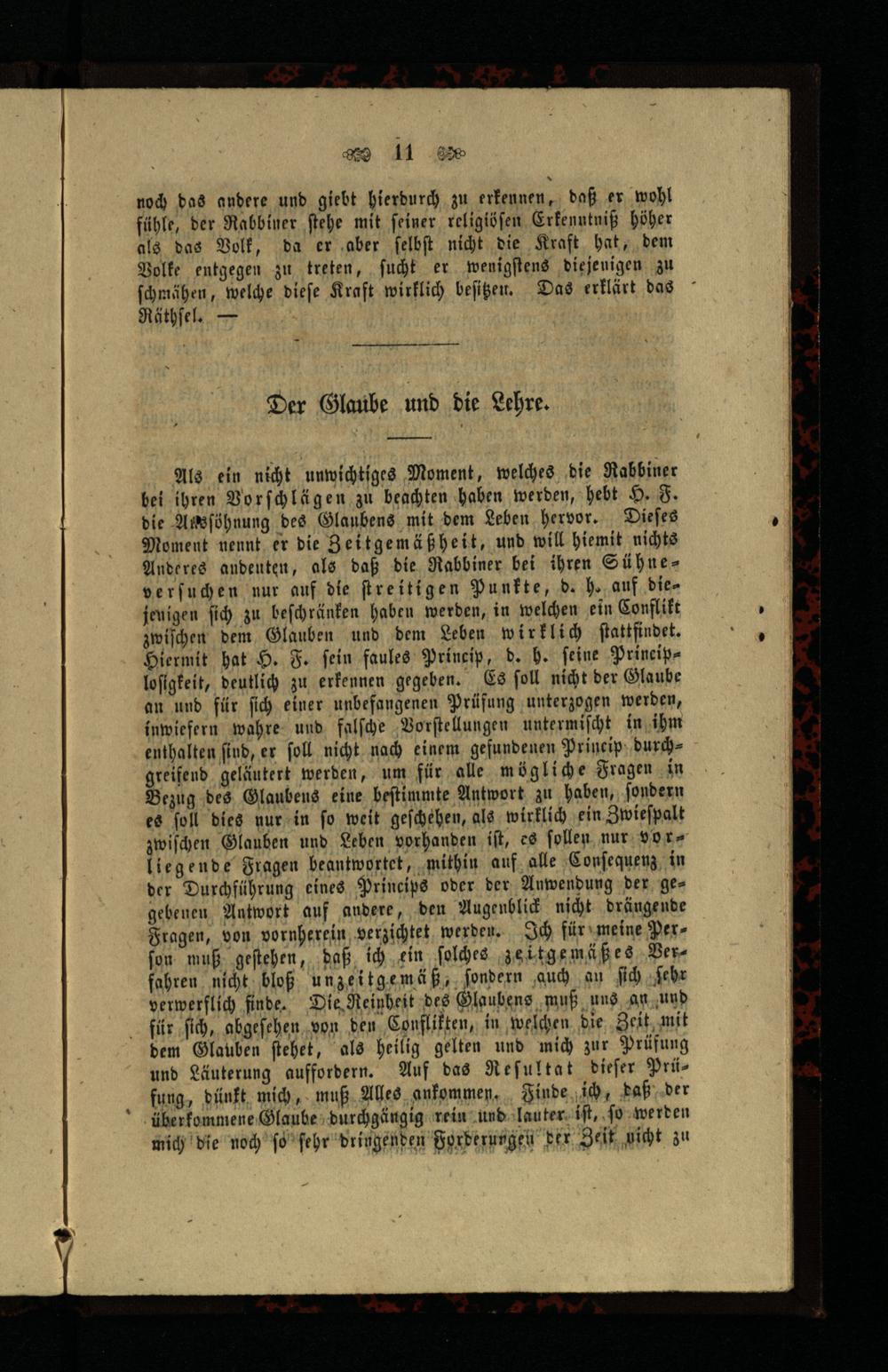 Als ein nicht unwichtiges Moment, welches die Rabbiner bei ihren Vorſchlägen zu beachten haben werden, hebt H. F. die Acsſöhnung des Glaubens mit dem Leben hervor. Dieſes Moment nennt er die Zeitgemäßheit, und will hiemit nichts Anderes andeuten, als daß die Rabbiner bei ihren Sühneverſuchen nur auf die ſtreitigen Punkte, d. h. auf diejenigen ſich zu beſchränken haben werden, in welchen ein Conflikt zwiſchen dem Glauben und dem Leben wirklich ſtattfindet. Hiermit hat H. F. ſein faules Princip, d. h. ſeine Prineiploſſgkeit, deutlich zu erkennen gegeben. Es ſoll nicht der Glaube an und für ſich einer unbefangenen Prüfung unterzogen werden, inwiefern wahre und falſche Vorſtellungen untermiſcht in ihm enthalten ſind, er ſoll nicht nach einem gefundenen Prineip durchgreifend geläutert werden, um für alle mögliche Fragen in Bezug des Glaubens eine beſtimmte Antwort zu haben, ſondern es ſoll dies nur in fo weit geſchehen, als wirklich ein Zwieſpalt zwiſchen Glauben und Leben vorhanden iſt, es ſollen nur vo rliegende Fragen beantwortet, mithin auf alle Conſequenz in der Durchführung eines Princips oder der Anwendung der gegebenen Antwort auf andere, den Augenblick nicht drängende Fragen, von vornherein verzichtet werden. Ich für meine Perſon muß geſtehen, daß ich ein ſolches zeitgemäßes Ver⸗= fahren nicht bloß unzeitgemäß, ſondern auch an ſich ſehr verwerflich finde. Die Reinheit des Glaubens muß uns an und, für ſich, abgeſehen von den Conflikten, in welchen die Zeit mit bem Glauben ſtehet, als heilig gelten und mich zur Prüfung und Läuterung auffordern. Auf das Reſultat dieſer Prüfung, dünkt, mich, muß Alles ankommen. Finde ich, daß der überkommene Glaube durchgängig rein und lauter iſt, ſo werden mich die noch ſo ſehr dringen den Forderungen der Zeit nicht zu