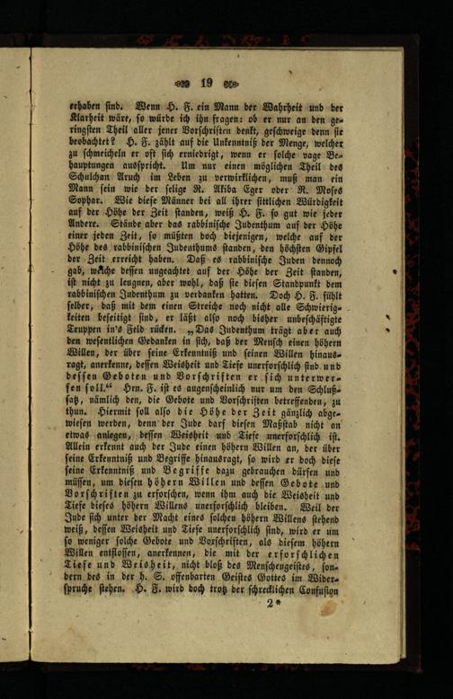 erhaben ſind. Wenn H. F. ein Mann der Wahrheit und der Klarheit wäre, ſo würde ich ihn fragen: ob er nur an den geringſten Theil aller jener Vorſchriften denkt, geſchweige denn ſie beobachtet? H. F. zählt auf die Unkenntniß der Menge, welcher zu ſchmeicheln er oft ſich erniedrigt, wenn er ſolche vage Behauptungen ausſpricht. Um nur einen möglichen Theil des Schulchan Aruch im Leben zu verwirklichen, muß man ein Mann ſein wie der ſelige R. Aliba Eger oder R. Moſes Sophar. Wie dieſe Männer bei all ihrer ſittlichen Würdigkeit auf der Höhe der Zeit ſtanden, weiß H. F. ſo gut wie jeder Andere. Stände aber das rabbiniſche Judenthum auf der Höhe einer jeden Zeit, fo müßten doch diejenigen, welche auf der Höhe des rabbiniſchen Judenthums ſtanden, den höchſten Gipfel der Zeit erreicht haben. Daß es rabbiniſche Juden dennoch gab, welche deſſen ungeachtet auf der Höhe der Zeit ſtanden, iſt nicht zu leugnen, aber wohl, daß fie dieſen Standpunkt dem rabbiniſchen Judenthum zu verdanken hatten. Doch H. F. fühlt ſelber, daß mit dem einen Streiche noch nicht alle Schwierigkeiten beſeitigt find, er läßt alſo noch bisher unbeſchäftigte Truppen in's Feld rücken.„Das Judenthum trägt aber auch den weſentlichen Gedanken in ſich, daß der Menſch einen höhern Willen, der über feine Erkenntniß und feinen Willen hinausragt, anerkenne, deſſen Weisheit und Tiefe unerforſchlich ſind und deſſen Geboten und Vorſchriften er ſich unterwerfen foll.“ Hrn. F. iſt es augenſcheinlich nur um den Schlußſatz, nämlich den, die Gebote und Vorſchriften betreffenden, zu thun. Hiermit ſoll alſo die Höhe der Zeit gänzlich abgewieſen werden, denn der Jude darf dieſen Maßſtab nicht an etwas anlegen, deſſen Weisheit und Tiefe unerforſchlich iſt. Allein erkennt auch der Jude einen höhern Willen an, der über feine Erkenntniß und Begriffe hinausragt, fo wird er doch dieſe ſeine Erkenntniß und Begriffe dazu gebrauchen dürfen und müſſen, um dieſen höhern Willen und deſſen Gebote und Vorſchriften zu erforſchen, wenn ihm auch die Weisheit und Tiefe dieſes höhern Willens unerforſchlich bleiben. Weil der Jude ſich unter der Macht eines ſolchen höhern Willens ſtehend weiß, deſſen Weisheit und Tiefe unerforſchlich ſind, wird er um fo weniger ſolche Gebote und Vorſchriften, als dieſem höhern Willen entfloſſen, anerkennen, die mit der erforſchlichen Tiefe und Weisheit, nicht bloß des Menſchengeiſtes, fon dern des in der h. S. offenbarten Geiſtes Gottes im Widerſpruche ſtehen. H. J. wird doch trotz der ſchrecklichen Confuſion 2*