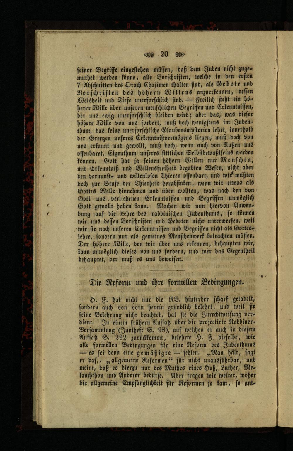 ſeiner Begriffe eingeſtehen müſſen, daß dem Juden nicht zugemuthet werden könne, alle Vorſchriften, welche in den erſten 7 Abſchnitten des Orach Chajimen thalten find, als Gebote und Vorſchriften des höhern Willens anzuerkennen, deſſen Weisheit und Tiefe unerforſchlich find.— Freilich ſteht ein höherer Wille über unſeren menſchlichen Begriffen und Erkenntniſſen, der uns ewig unerforſchlich bleiben wird; aber das, was diefer höhere Wille von uns fordert, muß doch wenigſtens im Judenihum, das keine unerforſchliche Glaubensmyſterien lehrt, innerhalb der Grenzen unſeres Erkenntnißvermögens liegen, muß doch von uns erkannt und gewollt, muß boch, wenn auch von Außen uns offenbaret, Eigenthum unſeres ſittlichen Selbſtbewußtſeins werden können. Gott hat ja ſeinen höhern Willen nur Menſchen, mit Erkenntniß und Willensfreiheit begabten Weſen, nicht aber den vernunft- und willenloſen Thieren offenbart, und wir müßten doch zur Stufe der Thierheit herabſinken, wenn wir etwas als Gottes Wille hinnehmen und üben wollten, was nach den von Gott uns verliehenen Erkenntniſſen und Begriffen unmöglich Gott gewollt haben kann. Machen wir nun hiervon Anwendung auf die Lehre des rabbiniſchen Judenthums, ſo können wir uns deſſen Vorſchriften und Geboten nicht unterwerfen, weil wir ſie nach unſeren Erkenntniſſen und Begriffen nicht als Gotteslehre, ſondern nur als gemeines Menſchenwerk betrachten müſſen. Der höhere Wille, den wir über uns erkennen, behaupten wir, kann unmöglich dieſes von uns fordern, und wer das Gegentheil behauptet, der muß es uns beweiſen.