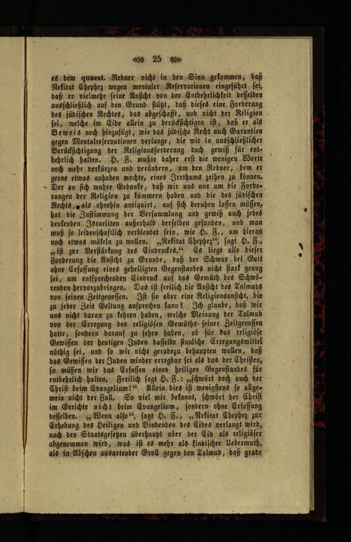 es dem quaest. Redner nicht in den Sinn gekommen, daß Nekitat Chephez wegen mentaler Reſervationen eingeführt ſei, daß er vielmehr ſeine Anſicht von der Entbehrlichkeit deſſelben ausſchließlich auf den Grund ſtützt, daß dieſes eine Forderung des jüdiſchen Rechtes, das abgeſchafft, und nicht der Religion ſei, welche im Eide allein zu berückſichtigen iſt, daß er als Beweis noch hinzufügt, wie das jüdiſche Recht auch Garantien gegen Mentalreſervationen verlange, die wir in ausſchließlicher Berückſichtigung der Religionsforderung doch gewiß für entbehrlich halten. H. F. mußte daher erſt die wenigen Worte noch mehr verkürzen und verändern, um den Redner, dem er gerne etwas anhaben mochte, eines Irrthums zeihen zu können. Der an ſich wahre Gedanke, daß wir uns nur um die Forderungen der Religion zu kümmern haben und die des jüdiſchen Rechts, als ohnehin antiquirt, auf ſich beruhen laſſen müſſen, hat die Zuſtimmung der Verſammlung und gewiß auch jedes denkenden Israeliten außerhalb derſelben gefunden, und man muß ſo leidenſchaftlich verblendet ſein, wie H. F., um hieran noch eiwas mäkeln zu wollen.„Nekitat Chephez“, ſagt H. F., „ſiſt zur Verſtärkung des Eindruckes.“ Es liegt alſo dieſer Forderung die Anſicht zu Grunde, daß der Schwur bei Gott ohne Erfaſſung eines geheiligten Gegenſtandes nicht ſtark genug ſei, um entſprechenden Eindruck auf das Gemüth des Schwörenden hervorzubringen. Das iſt freilich die Anſicht des Talmuds von feinen Zeitgenoſſen. Iſt fie aber eine Religionsanſicht, die zu jeder Zeit Geltung anſprechen kann? Ich glaube, daß wir uns nicht daran zu kehren haben, welche Meinung der Talmud von der Erregung des religiöſen Gemüths feiner, Zeitgenoſſen hatte, ſondern darauf zu ſehen haben, ob für das religiöſe Gewiſſen der heutigen Juden daſſelbe ſinnliche Erregungsmittel nöthig ſei, und ſo wir nicht geradezu behaupten wollen, daß das Gewiſſen der Juden minder erregbar ſei als das der Chriſten, ſo müſſen wir das Erfaſſen eines heiligen Gegenſtandes für entbehrlich halten. Freilich ſagt H. F.:„ſchwört doch auch der Chriſt beim Evangelium!“ Allein dies iſt wenigſtens fo allge. mein nicht der Fall. So viel mir bekannt, ſchwört der Chriſt im Gerichte nicht beim Evangelium, ſondern ohne Erfaſſung deſſelben.„Wenn alſo“, ſagt H. F.,„Nekitat Chephez zur Erhebung des Heiligen und Bindenden des Eides verlangt wird, nach den Staatsgeſetzen überhaupt aber der Eid als religiöſer abgenommen wird, was iſt es mehr als kindiſcher Uebermuth, als in Abſcheu ausartender Groll gegen den Talmud, daß grade