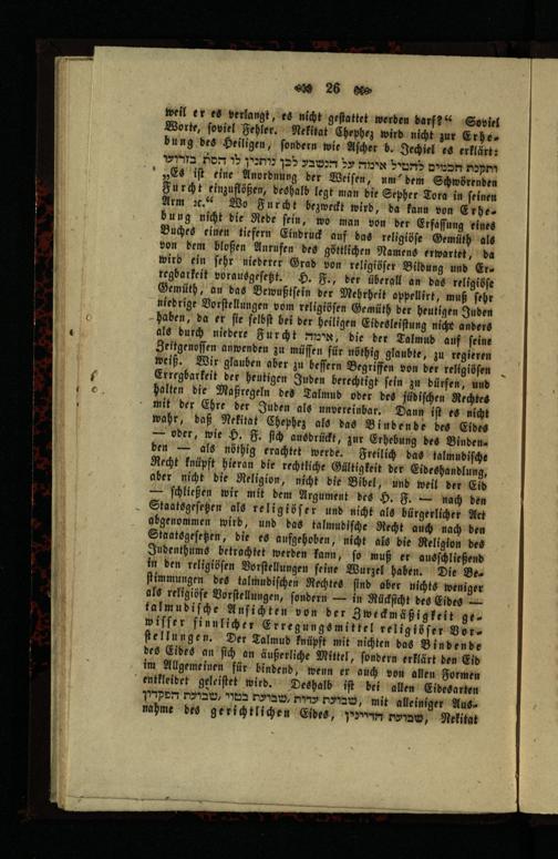 ,, Es ist eine Anordnung der Weisen, um dem Schwörenden Furcht einzuflößen, deshalb legt man die Sepher Tora in seinen Arm c." Wo Furcht bezweckt wird, da kann von Erhebung nicht die Rede sein, wo man von der Erfassung eines Buches einen tiefern Eindruck auf das religiöse Gemüth als von dem bloßen Anrufen des göttlichen Namens erwartet, da wird ein sehr niederer Grad von religiöser Bildung und Erregbarkeit vorausgesetzt. H. F., der überall an das religiöse Gemüth, an das Bewußtsein der Mehrheit appellirt, muß sehr niedrige Vorstellungen vom religiösen Gemüth der heutigen Juden -haben, da er sie selbst bei der heiligen Eidesleistung nicht anders als durch niedere Furcht, die der Talmud auf seine Zeitgenossen anwenden zu müssen für nöthig glaubte, zu regieren weiß. Wir glauben aber zu beffern Begriffen von der religiösen Erregbarkeit der heutigen Juden berechtigt sein zu dürfen, und halten die Maßregeln des Talmud oder des jüdischen Rechtes mit der Ehre der Juden als unvereinbar. Dann ist es nicht wahr, daß Nekitat Chephez als das Bindende des Eides ober, wie H. F. sich ausdrückt, zur Erhebung des Binden ben als nöthig erachtet werde. Freilich das talmudische Recht knüpft hieran die rechtliche Gültigkeit der Eideshandlung, aber nicht die Religion, nicht die Bibel, und weil der Eib
