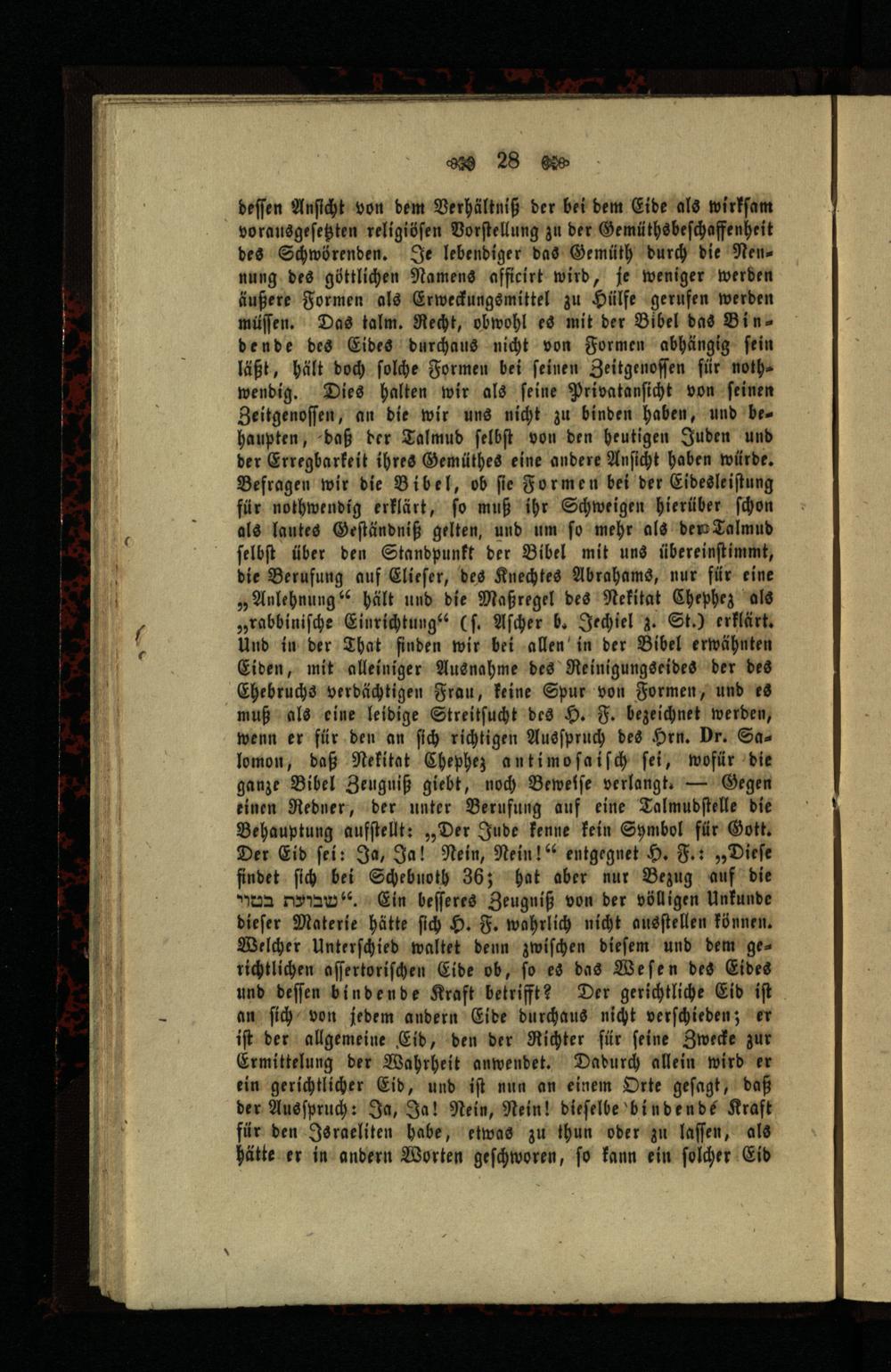 deſſen Anſicht von dem Verhältniß der bei dem Eide als wirkſam vorausgeſetzten religiöſen Vorſtellung zu der Gemüthsbeſchaffenheit des Schwörenden. Je lebendiger das Gemüth durch die Nennung des göttlichen Namens afficirt wird, je weniger werden äußere Formen als Erweckungsmittel zu Hülfe gerufen werden müſſen. Das talm. Recht, obwohl es mit der Bibel das Bindende des Eides durchaus nicht von Formen abhängig ſein läßt, hält doch ſolche Formen bei ſeinen Zeitgenoſſen für nothwendig. Dies halten wir als ſeine Privatanſicht von ſeinen Zeitgenoſſen, an die wir uns nicht zu binden haben, und bes haupten, daß der Talmud ſelbſt von den heutigen Juden und der Erregbarkeit ihres Gemüthes eine andere Anſicht haben würde. Befragen wir die Bibel, ob ſie Formen bei der Eidesleiſtung für nothwendig erklärt, ſo muß ihr Schweigen hierüber ſchon als lautes Geſtändniß gelten, und um ſo mehr als dem Talmud ſelbſt über den Standpunkt der Bibel mit uns übereinſtimmt, die Berufung auf Elieſer, des Knechtes Abrahams , nur für eine „Anlehnung“ hält und die Maßregel des Nekitat Chephez als „rabbiniſche Einrichtung?“(ſ. Aſcher b. Jechiel z. St.) erklärt. Und in der That finden wir bei allen in der Bibel erwähnten Eiden, mit alleiniger Ausnahme des Reinigungseides der des Ehebruchs verdächtigen Frau, keine Spur von Formen, und es muß als eine leidige Streitſucht des H. F. bezeichnet werden, wenn er für den an ſich richtigen Ausſpruch des Hrn. Dr. Salomon, daß Nekitat Chephez antimoſaiſch ſei, wofür die ganze Bibel Zeugniß giebt, noch Beweſſe verlangt:— Gegen einen Redner, der unter Berufung auf eine Talmudſtelle die Behauptung aufſtellt:„Der Jude kenne kein Symbol für Gott . Der Eid ſei: Ja, Ja! Nein, Nein!“ entgegnet H. F.:„Dieſe findet ſich bei Schebuoth 36; hat aber nur Bezug auf die Men myaaw* Ein beſſeres Zeugniß von der völligen Unkunde dieſer Materie hätte ſich H. F. wahrlich nicht ausſtellen können. Welcher Unterſchied waltet denn zwiſchen dieſem und dem gerichtlichen aſſertoriſchen Eide ob, fo es das Weſen des Eides und deſſen bindende Kraft betrifft? Der gerichtliche Eid iſt an ſich' von jedem andern Eide durchaus nicht verſchieben; er iſt der allgemeine Eid, den der Richter für ſeine Zwecke zur Ermittelung der Wahrheit anwendet. Dadurch allein wird er ein gerichtlicher Eid, und iſt nun an einem Orte geſagt, daß der Ausſpruch: Ja, Ja! Nein, Nein! dieſelbe bindende Kraft für den Israeliten habe, etwas zu thun oder zu laſſen, als hätte er in andern Worten geſchworen, ſo kann ein folder Eid