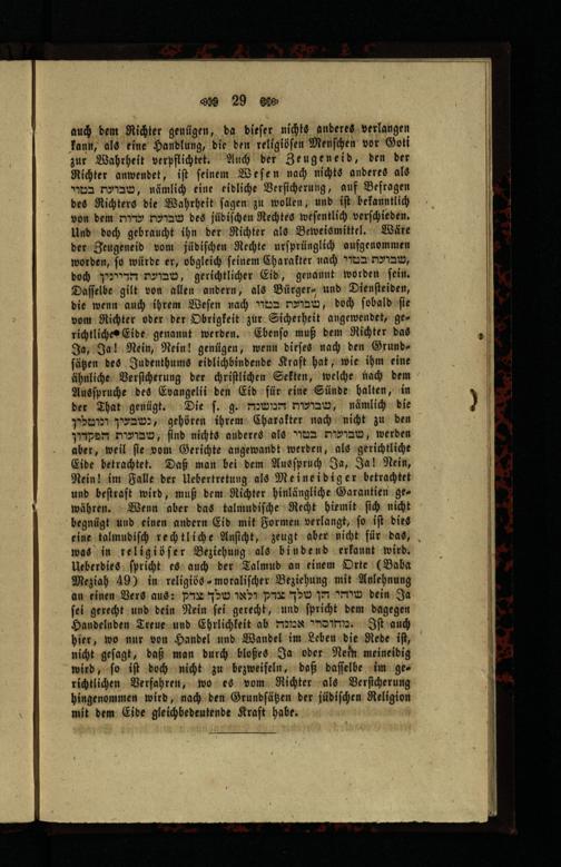 vom Richter oder der Obrigkeit zur Sicherheit angewendet, gerichtliche Eide genannt werden. Ebenso muß dem Richter das Ja, Ja! Nein, Nein! genügen, wenn dieses nach den Grundfäßen des Jubenthums eiblichbindende Kraft hat, wie ihm eine ähnliche Versicherung der christlichen Sekten, welche nach dem Ausspruche des Evangelii den Eid für eine Sünde halten, in der That genügt. Die s. g. m nämlich die
