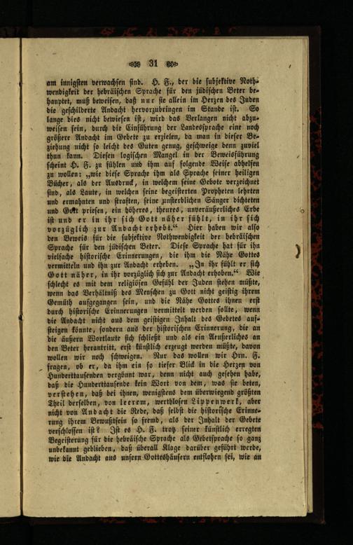 am innigſten verwachſen ſind. H. F., der die ſubjektive Notha wendigkeil der hebräiſchen Sprache für den jüdiſchen Beter be= hauptet, muß beweiſen, daß nur fie allein im Herzen des Juden die geſchilderte Andacht hervorzubringen im Stande iſt. So lange dies nicht bewieſen iſt, wird das Verlangen nicht abzuweſſen fein, durch die Einführung der Landesſprache eine noch größere Andacht im Gebete zu erzielen, da man in dieſer Beziehung nicht ſo leicht des Guten genug, geſchweige denn zuviel thun kann. Dieſen logiſchen Mangel in der Beweisführung ſcheint H. F. zu fühlen und ihm auf folgende Weiſe abhelfen zu wollen:„wie dieſe Sprache ihm als Sprache ſeiner heiligen Bücher, als der Ausdruck, in welchem ſeine Gebote verzeichnet ſind, als Laute, in welchen ſeine begeiſterten Propheten lehrten und ermahnten und ſtraften, feine unſterblichen Sänger dichteten und Gant prieſen, ein höheres, theures, unveräußerliches Erbe iſt und er in ihr ſich Gott näher fühlt, in ihr ſich vorzüglich zur Andacht erhebt.“ Hier haben wir alſo den Beweis für die ſubjektive Nothwenbigkeit der hebräiſchen Sprache für den jüdiſchen Beter. Dieſe Sprache hat für ihn vielfache hiſtoriſche Erinnerungen, die ihm die Nähe Gottes vermitteln und ihn zur Andacht erheben.„In ihr fühlt er ſich Gott näher, in ihr vorzüglich ſich zur Andacht erhoben.“ Wie ſchlecht es mit dem religiöſen Gefühl der Juden ſtehen müßte, wenn das Verhältniß des Menſchen zu Gott nicht geiſtig ihrem Gemüth aufgegangen ſein, und die Nähe Gottes ihnen erſt durch hiſtoriſche Erinnerungen vermittelt werden ſollte, wenn die Andacht nicht aus dem geiſtigen Inhalt des Gebetes aufſteigen könnte, fondern aus der hiſtoriſchen Erinnerung, die an die äußern Wortlaute ſich ſchließt und als ein Aeußerliches an den Beter herantritt, erſt künſtlich erzeugt werden müßte, davon wollen wir noch ſchweigen. Nur das wollen wir Hrn. F. fragen, ob er, da ihm ein ſo tiefer Blick in die Herzen von Hunderttauſenden vergönnt war, denn nicht auch geſehen habe, daß die Hunderttauſende kein Wort von dem, was ſie beten, verſtehen, daß bei ihnen, wenigſtens dem überwiegend größten Theil derſelben, von leerem, werthloſen Lippenwerk, aber nicht von Andacht die Rede, daß ſelbſt die hiſtorſſche Erinne= rung ihrem Bewußtſein ſo fremd, als der Inhalt der Gebete verſchloſſen iſt? Iſt es H. F. trotz ſeiner künſtlich erregten Begeiſterung für die hebräiſche Sprache als Gebetſprache ſo ganz unbekannt geblieben daß überall Klage darüber geführt werde, wie die Andacht aus unſern Gotteshäuſern entflohen ſei, wie an