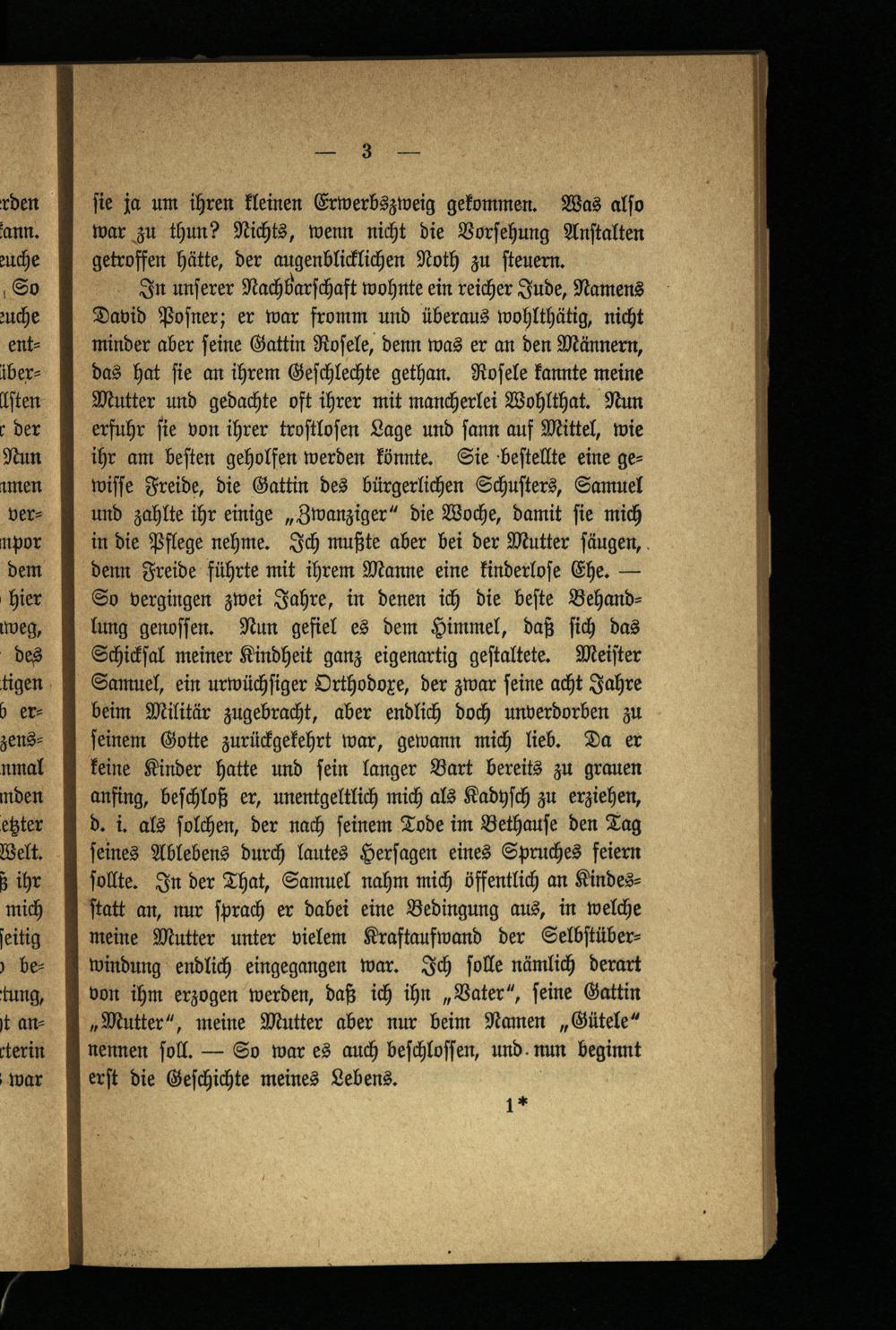 In unſerer Nachbarſchaft wohnte ein reicher Jude, Namens David Poſner; er war fromm und überaus wohlthätig, nicht minder aber ſeine Gattin Roſele, denn was er an den Männern, das hat ſie an ihrem Geſchlechte gethan. Roſele kannte meine Mutter und gedachte oft ihrer mit mancherlei Wohlthat. Nun erfuhr ſie von ihrer troſtloſen Lage und ſann auf Mittel, wie ihr am beſten geholfen werden könnte. Sie beſtellte eine gewiſſe Freide, die Gattin des bürgerlichen Schuſters, Samuel und zahlte ihr einige„Zwanziger“ die Woche, damit ſie mich in die Pflege nehme. Ich mußte aber bei der Mutter ſäugen, denn Freide führte mit ihrem Manne eine kinderloſe Ehe.— So vergingen zwei Jahre, in denen ich die beſte Behandlung genoſſen. Nun gefiel es dem Himmel, daß ſich das Schickſal meiner Kindheit ganz eigenartig geſtaltete. Meiſter Samuel, ein urwüchſiger Orthodoxe, der zwar ſeine acht Jahre beim Militär zugebracht, aber endlich doch unverdorben zu ſeinem Gotte zurückgekehrt war, gewann mich lieb. Da er keine Kinder hatte und ſein langer Bart bereits zu grauen anfing, beſchloß er, unentgeltlich mich als Kadyſch zu erziehen, d. i. als ſolchen, der nach feinem Tode im Bethauſe den Tag ſeines Ablebens durch lautes Herſagen eines Spruches feiern ſollte. In der That, Samuel nahm mich öffentlich an Kindesſtatt an, nur ſprach er dabei eine Bedingung aus, in welche meine Mutter unter vielem Kraftaufwand der Selbſtüberwindung endlich eingegangen war. Ich ſolle nämlich derart