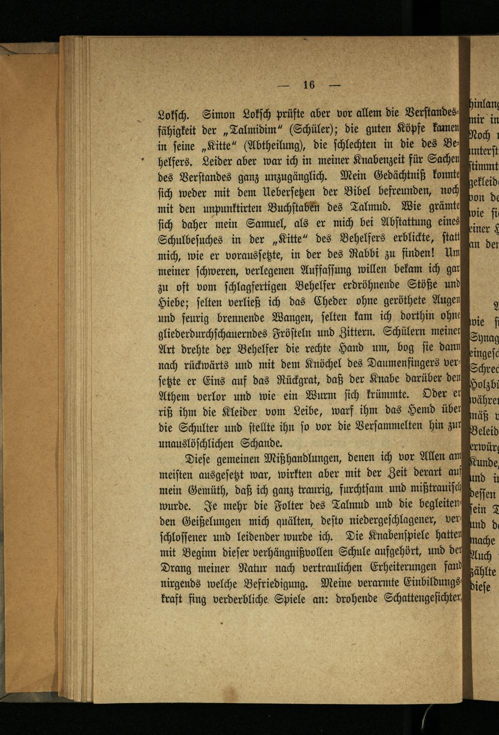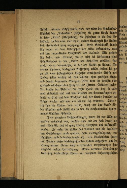 Dieſe gemeinen Mißhandlungen, denen ich vor Allen am meiſten ausgeſetzt war, wirkten aber mit der Zeit derart auf mein Gemüth, daß ich ganz traurig, furchtſam und mißtrauiſch wurde. Je mehr die Folter des Talmud und die begleiten, den Geißelungen mich quälten, deſto niedergeſchlagener, ver, ſchloſſener und leidender wurde ich. Die Knabenſpiele hatten mit Beginn dieſer verhängnißvollen Schule aufgehört, und der Drang meiner Natur nach vertraulichen Erheiterungen fand nirgends welche Befriedigung. Meine verarmte Einbildungs kraft fing verderbliche Spiele an: drohende Schattengeſichter