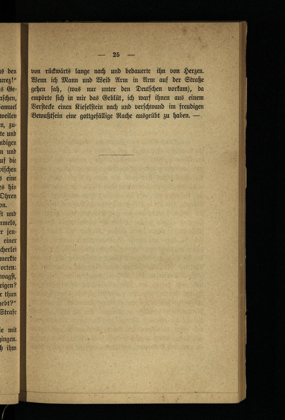 von rückwärts lange nach und bedauerte ihn von Herzen. Wenn ich Mann und Weib Arm in Arm auf der Straße gehen ſah,(was nur unter den Deutſchen vorkam), da empörte ſich in mir das Geblüt, ich warf ihnen aus einem Verſtecke einen Kieſelſtein nach und verſchwand im freudigen Bewußtſein eine gottgefällige Rache ausgeübt zu haben.—