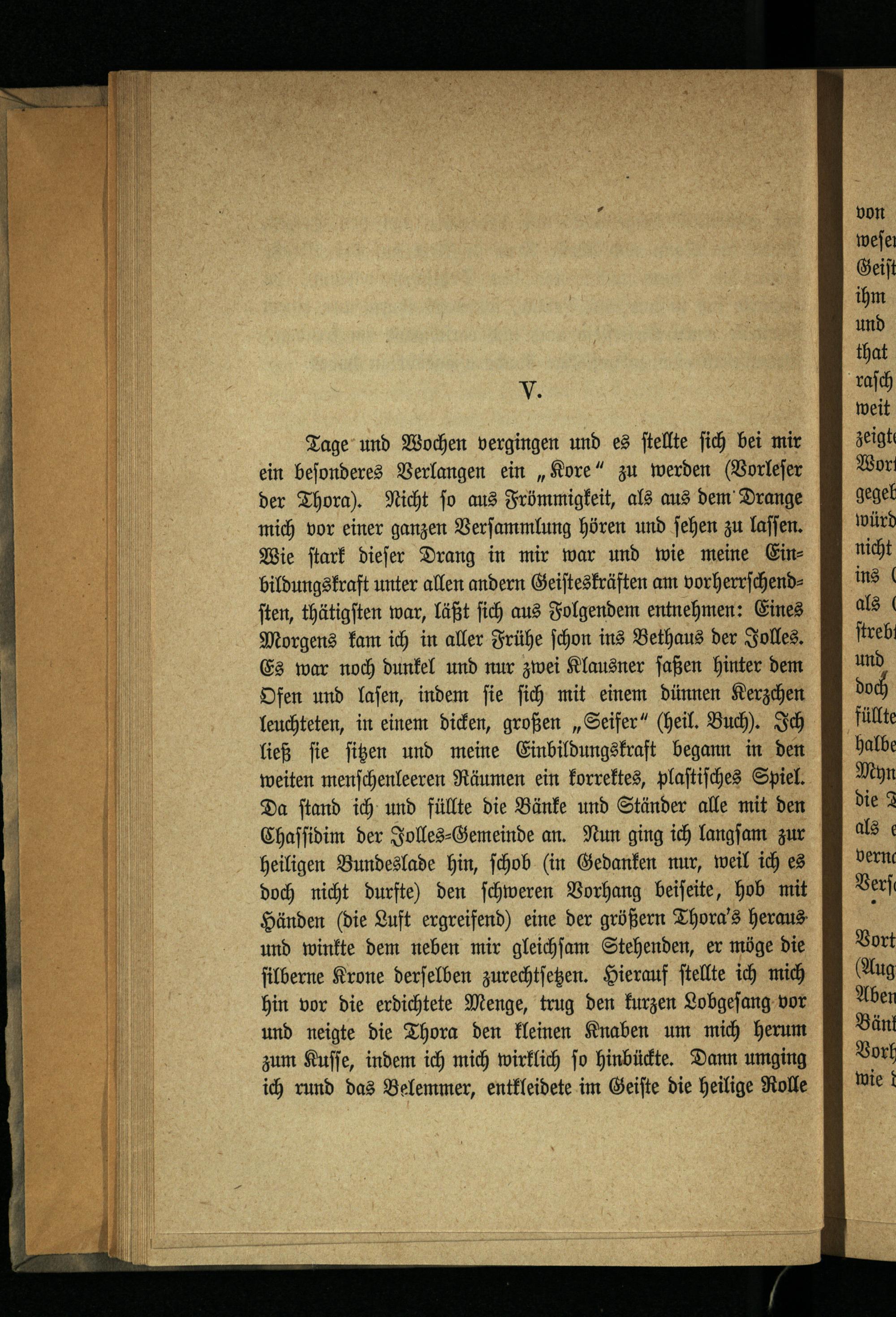 Tage und Wochen vergingen und es ſtellte ſich bei mir ein beſonderes Verlangen einKore zu werden Vorleſer der Thora). Nicht ſo aus Frömmigkeit, als aus dem Drange mich vor einer ganzen Verſammlung hören und ſehen zu laſſen. Wie ſtark dieſer Drang in mir war und wie meine Ein­bildungskraft unter allen andern Geiſteskräften am vorherrſchend­ſten, thätigſten war, läßt ſich aus Folgendem entnehmen: Eines Morgens kam ich in aller Frühe ſchon ins Bethaus der Jolles. Es war noch dunkel und nur zwei Klausner ſaßen hinter dem Ofen und laſen, indem ſie ſich mit einem dünnen Kerzchen leuchteten, in einem dicken, großenSeifer(heil. Buch. Ich ließ ſie ſitzen und meine Einbildungskraft begann in den weiten menſchenleeren Räumen ein korrektes, plaſtiſches Spiel. Da ſtand ich und füllte die Bänke und Ständer alle mit den Chaſſidim der Jolles⸗Gemeinde an. Nun ging ich langſam zur heiligen Bundeslade hin, ſchob in Gedanken nur, weil ich es doch nicht durfte) den ſchweren Vorhang beiſeite, hob mit Händen(die Luft ergreifend) eine der größern Thora's heraus und winkte dem neben mir gleichſam Stehenden, er möge die ſilberne Krone derſelben zurechtſetzen. Hierauf ſtellte ich mich hin vor die erdichtete Menge, trug den kurzen Lobgeſang vor und neigte die Thora den kleinen Knaben um mich herum zum Kuſſe, indem ich mich wirklich ſo hinbückte. Dann umging ich rund das Belemmer, entkleidete im Geiſte die heilige Rolle