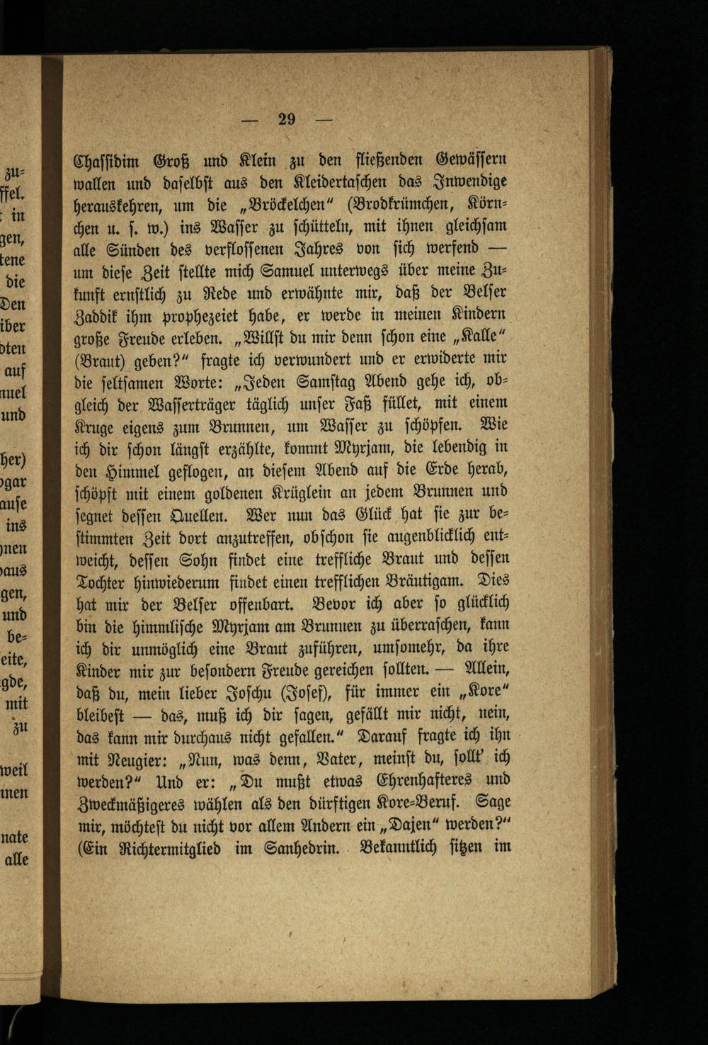 Chaſſidim Groß und Klein zu den fließenden Gewäſſern wallen und daſelbſt aus den Kleidertaſchen das Inwendige herauskehren, um die„Bröckelchen(Brodkrümchen, Körnchen u. ſ. w. ins Waſſer zu ſchütteln, mit ihnen gleichſam alle Sünden des verfloſſenen Jahres von ſich werfend— um dieſe Zeit ſtellte mich Samuel unterwegs über meine Zukunft ernſtlich zu Rede und erwähnte mir, daß der Belſer Zaddik ihm prophezeiet habe, er werde in meinen Kindern große Freude erleben.„Willſt du mir denn ſchon eine„Kalle“ (Braut) geben?“ fragte ich verwundert und er erwiderte mir die ſeltſamen Worte:„Jeden Samſtag Abend gehe ich, obgleich der Waſſerträger täglich unſer Faß füllet, mit einem Kruge eigens zum Brunnen, um Waſſer zu ſchöpfen. Wie ich dir ſchon längſt erzählte, kommt Myrjam, die lebendig in den Himmel geflogen, an dieſem Abend auf die Erde herab, ſchöpft mit einem goldenen Krüglein an jedem Brunnen und ſegnet deſſen Quellen. Wer nun das Glück hat ſie zur beſtimmten Zeit dort anzutreffen, obſchon fie augenblicklich entweicht, deſſen Sohn findet eine treffliche Braut und deſſen Tochter hinwiederum findet einen trefflichen Bräutigam. Dies hat mir der Belſer offenbart. Bevor ich aber ſo glücklich bin die himmliſche Myrjam am Brunnen zu überraſchen, kann ich dir unmöglich eine Braut zuführen, umſomehr, da ihre Kinder mir zur beſondern Freude gereichen ſollten.— Allein, daß du, mein lieber Joſchu(Joſeſ, für immer ein„Kore“ bleibeſt— das, muß ich dir ſagen, gefällt mir nicht, nein, das kann mir durchaus nicht gefallen.“ Darauf fragte ich ihn mit Neugier:„Nun, was denn, Vater, meinſt du, ſollt ich werden?“ Und er:„Du mußt etwas Ehrenhafteres und Zweckmäßigeres wählen als den dürftigen Kore⸗Beruf. Sage mir, möchteſt du nicht vor allem Andern ein, Dajen“ werden?“ (Ein Richtermitglied im Sanhedrin. Bekanntlich ſitzen im