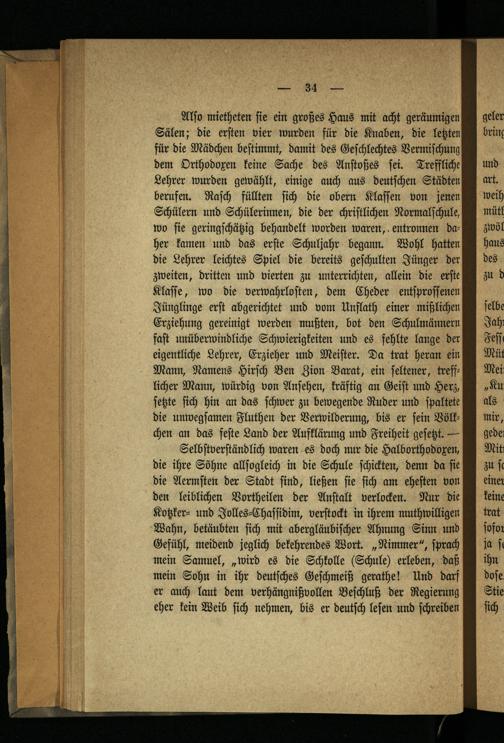 Alſo mietheten fie ein großes Haus mit acht geräumigen Sälen; die erſten vier wurden für die Knaben, die letzten für die Mädchen beſtimmt, damit des Geſchlechtes Vermiſchung dem Orthodoxen keine Sache des Anſtoßes ſei. Treffliche Lehrer wurden gewählt, einige auch aus deutſchen Städten berufen. Raſch füllten ſich die obern Klaſſen von jenen Schülern und Schülerinnen, die der chriſtlichen Normalſchule, wo ſie geringſchätzig behandelt worden waren, entronnen daher kamen und das erſte Schuljahr begann. Wohl hatten die Lehrer leichtes Spiel die bereits geſchulten Jünger der zweiten, dritten und vierten zu unterrichten, allein die erſte Klaſſe, wo die verwahrloſten, dem Cheder entſproſſenen Jünglinge erſt abgerichtet und vom Unflath einer mißlichen Erziehung gereinigt werden mußten, bot den Schulmännern faſt unüberwindliche Schwierigkeiten und es fehlte lange der eigentliche Lehrer, Erzieher und Meiſter. Da trat heran ein Mann, Namens Hirſch Ben Zion Barat, ein ſeltener, treff