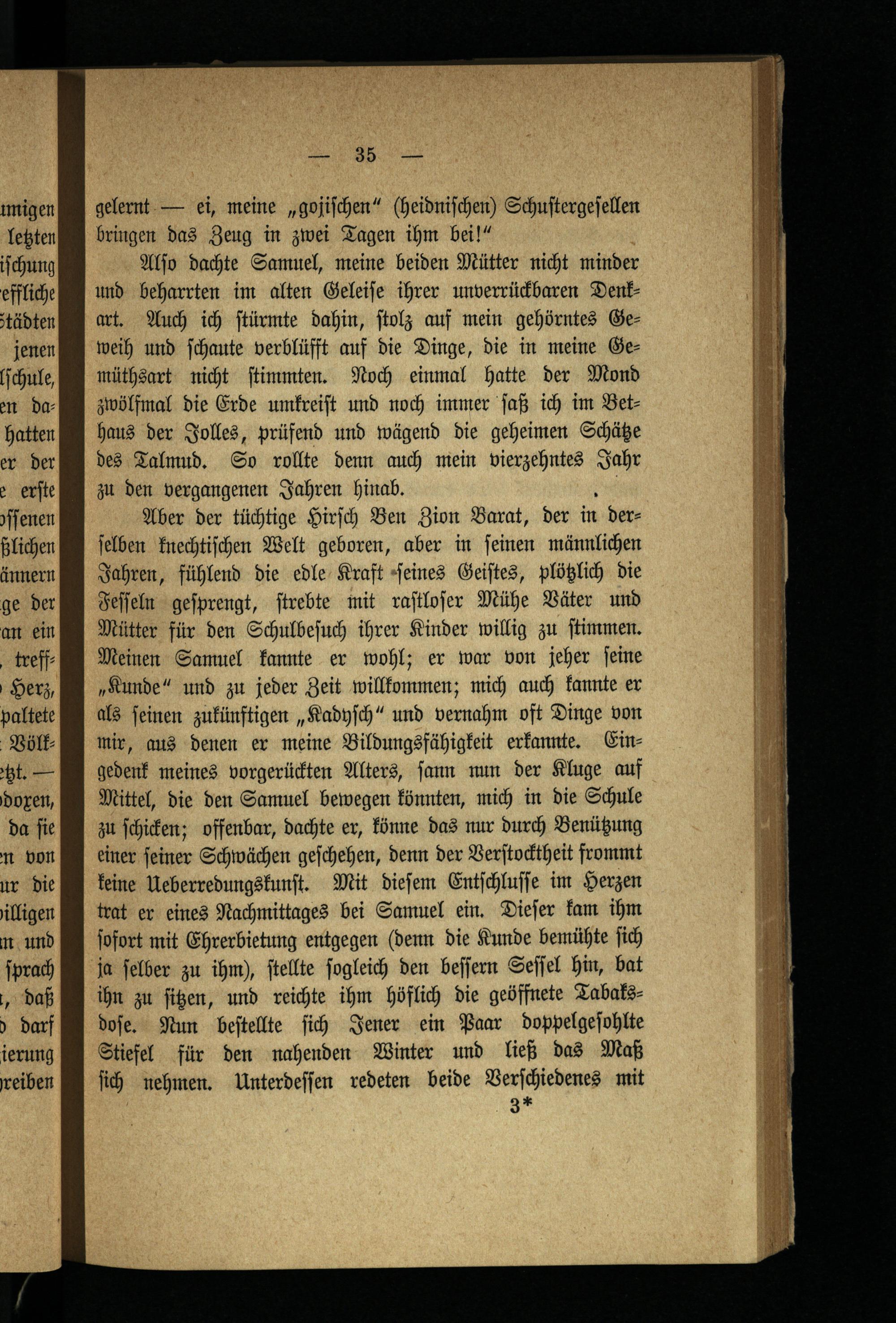 Aber der tüchtige Hirſch Ben Zion Barat, der in ü derſelben knechtiſchen Welt geboren, aber in feinen männlichen Jahren, fühlend die edle Kraft ſeines Geiſtes, plötzlich die Feſſeln geſprengt, ſtrebte mit raſtloſer Mühe Väter und Mütter für den Schulbeſuch ihrer Kinder willig zu ſtimmen. Meinen Samuel kannte er wohl; er war von jeher ſeine „Kunde“ und zu jeder Zeit willkommen; mich auch kannte er als feinen zukünftigen ‚Kadyſch“ und vernahm oft Dinge von mir, aus denen er meine Bildungsfähigkeit erkannte. Eingedenk meines vorgerückten Alters, ſann nun der Kluge auf Mittel, die den Samuel bewegen könnten, mich in die Schule zu ſchicken; offenbar, dachte er, könne das nur durch Benützung einer ſeiner Schwächen geſchehen, denn der Verſtocktheit frommt keine Ueberredungskunſt. Mit dieſem Entſchluſſe im Herzen trat er eines Nachmittages bei Samuel ein. Dieſer kam ihm ſofort mit Ehrerbietung entgegen(denn die Kunde bemühte ſich ja ſelber zu ihm, ſtellte ſogleich den beſſern Seſſel hin, bat ihn zu ſitzen, und reichte ihm höflich die geöffnete Tabaksdoſe. Nun beſtellte ſich Jener ein Paar doppelgeſohlte Stiefel für den nahenden Winter und ließ das Maß ſich nehmen. Unterdeſſen redeten beide Verſchiedenes mit