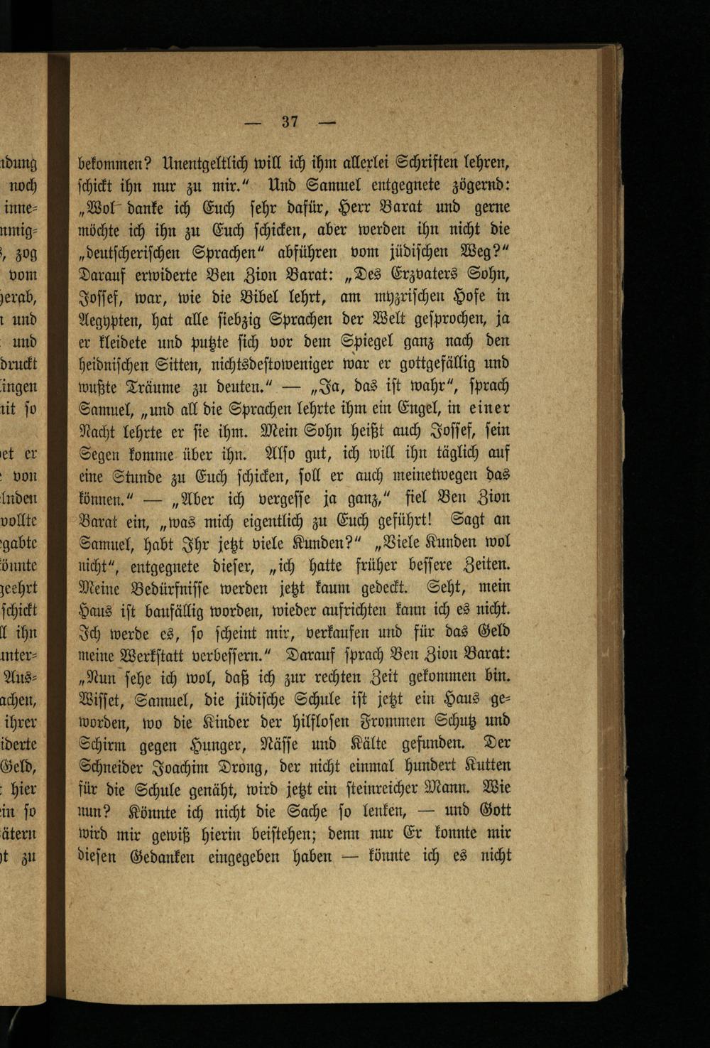 bekommen? Unentgeltlich will ich ihm allerlei Schriften lehren, ſchickt ihn nur zu mir.“ Und Samuel entgegnete zögernd: Wol danke ich Euch ſehr dafür, Herr Barat und gerne möchte ich ihn zu Euch ſchicken, aber werden ihn nicht die deutſcheriſchen Sprachen“ abführen vom jüdiſchen Weg?“ Darauf erwiderte Ben Zion Barat:„Des Erzvaters Sohn, Joſſef, war, wie die Bibel lehrt, am myzriſchen Hofe in Aegypten , hat alle ſiebzig Sprachen der Welt geſprochen, ja er kleidete und putzte ſich vor dem Spiegel ganz nach den heidniſchen Sitten, nichtsdeſtoweniger war er gottgefällig und wußte Träume zu deuten.“—„Ja, das iſt wahr“, ſprach Samuel,„und all die Sprachen lehrte ihm ein Engel, in einer Nacht lehrte er fie ihm. Mein Sohn heißt auch Joſſef, fein Segen komme über ihn. Alſo gut, ich will ihn täglich auf eine Stunde zu Euch ſchicken, ſoll er auch meinetwegen das können.“—„Aber ich vergeſſe ja ganz,“ fiel Ben Zion Barat ein,„was mich eigentlich zu Euch geführt! Sagt an Samuel, habt Ihr jetzt viele Kunden?“„Viele Kunden wol nicht“, entgegnete dieſer,„ich hatte früher beſſere Zeiten. Meine Bedürfniſſe werden jetzt kaum gedeckt. Seht, mein Haus iſt baufällig worden, wieder aufrichten kann ich es nicht. Ich werde es, ſo ſcheint mir, verkaufen und für das Geld meine Werkſtatt verbeſſern. Darauf ſprach Ben Zion Barat: „Nun ſehe ich wol, daß ich zur rechten Zeit gekommen bin. Wiſſet, Samuel, die jüdiſche Schule iſt jetzt ein Haus geworden, wo die Kinder der hilfloſen Frommen Schutz und Schirm gegen Hunger, Näſſe und Kälte gefunden. Der Schneider Joachim Drong, der nicht einmal hundert Kutten für die Schule genäht, wird jetzt ein ſteinreicher Mann. Wie nun? Könnte ich nicht die Sache ſo lenken,— und Gott wird mir gewiß hierin beiſtehen; denn nur Er konnte mir dieſen Gedanken eingegeben haben— könnte ich es nicht