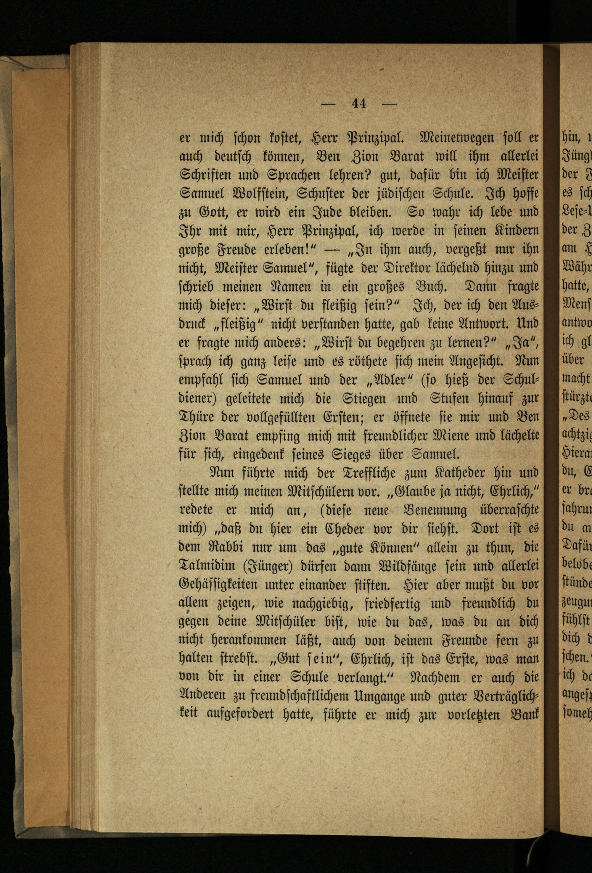 er mich ſchon koſtet, Herr Prinzipal. Meinetwegen ſoll er auch deutſch können, Ben Zion Barat will ihm allerlei Schriften und Sprachen lehren? gut, dafür bin ich Meiſter Samuel Wolfſtein, Schuſter der jüdiſchen Schule. Ich hoffe zu Gott, er wird ein Jude bleiben. So wahr ich lebe und Ihr mit mir, Herr Prinzipal, ich werde in ſeinen Kindern große Freude erleben!“—„In ihm auch, vergeßt nur ihn nicht, Meiſter Samuel“, fügte der Direktor lächelnd hinzu und ſchrieb meinen Namen in ein großes Buch. Dann fragte mich dieſer:„Wirſt du fleißig fein?“ Ich, der ich den Aus— druck„fleißig“ nicht verſtanden hatte, gab keine Antwort. Und er fragte mich anders:„Wirſt du begehren zu lernen?“„Ja“, ſprach ich ganz leiſe und es röthete ſich mein Angeſicht. Nun empfahl ſich Samuel und der„Adler“(fo hieß der Schul— diener) geleitete mich die Stiegen und Stufen hinauf zur Thüre der vollgefüllten Erſten; er öffnete ſie mir und Ben Zion Barat empfing mich mit freundlicher Miene und lächelte für ſich, eingedenk ſeines Sieges über Samuel.