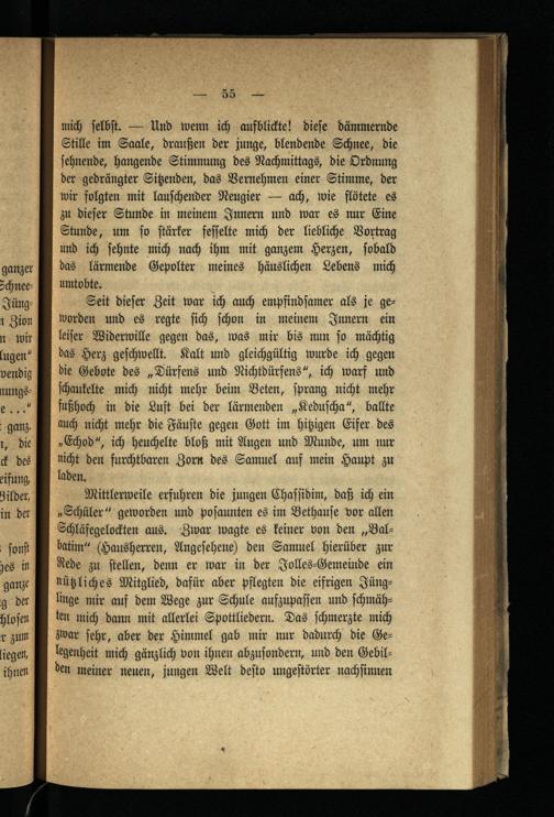 Mittlerweile erfuhren die jungen Chaſſidim, daß ich ein „Schüler“ geworden und poſaunten es im Bethauſe vor allen Schläfegelockten aus. Zwar wagte es keiner von den„Balbatim“(Hausherren, Angeſehene) den Samuel hierüber zur Rede zu ſtellen, denn er war in der Jolles-Gemeinde ein nützliches Mitglied, dafür aber pflegten die eifrigen Jünglinge mir auf dem Wege zur Schule aufzupaſſen und ſchmähten mich dann mit allerlei Spottliedern. Das ſchmerzte mich zwar ſehr, aber der Himmel gab mir nur dadurch die Gelegenheit mich gänzlich von ihnen abzuſondern, und den Gebilden meiner neuen, jungen Welt deſto ungeſtörter nachfinnen