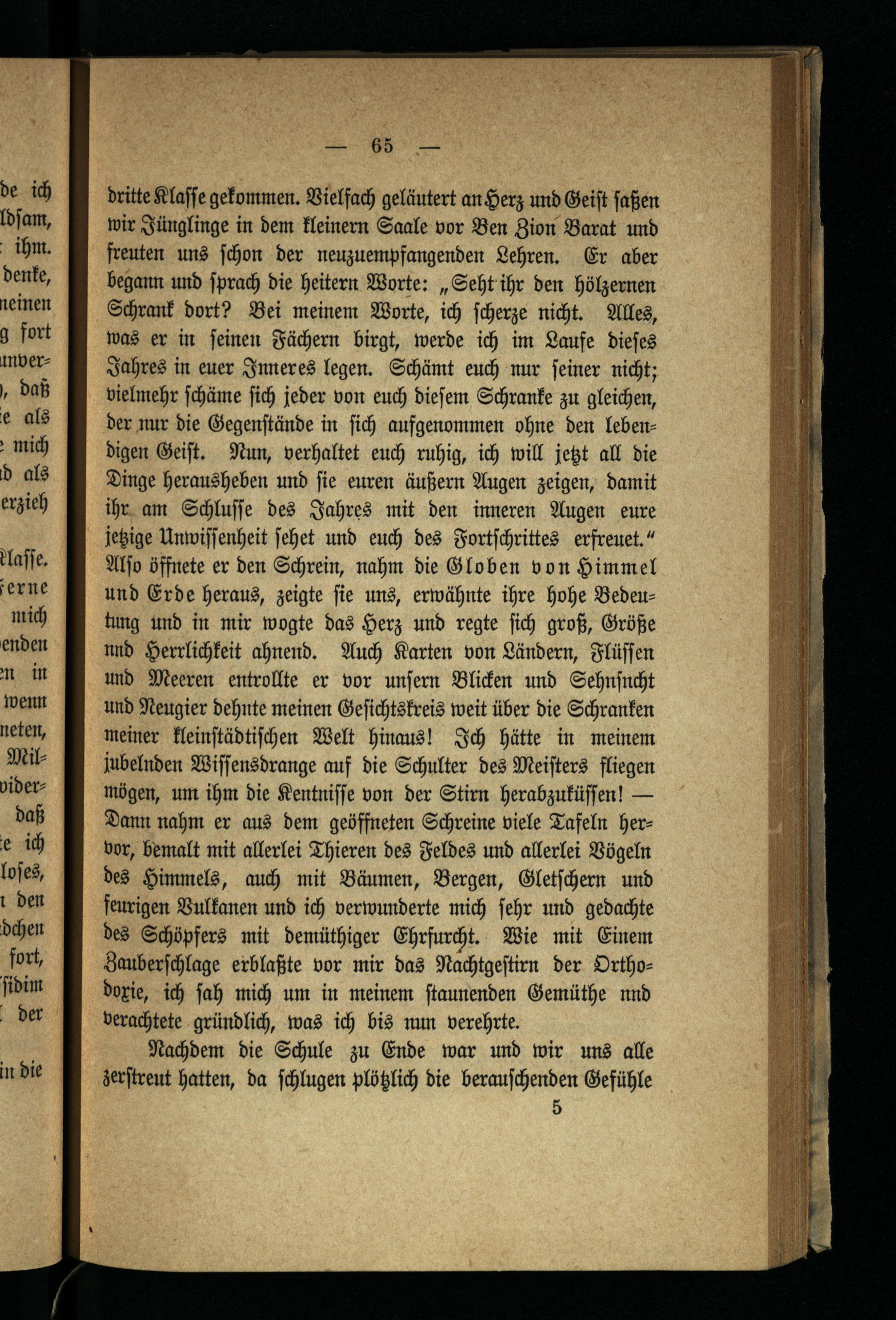 dritte Klaſſe gekommen. Vielfach geläutert an Herz und Geiſt ſaßen wir Jünglinge in dem kleinern Saale vor Ben Zion Barat und freuten uns ſchon der neuzuempfangenden Lehren. Er aber begann und ſprach die heitern Worte:„Seht ihr den hölzernen Schrank dort? Bei meinem Worte, ich ſcherze nicht. Alles, was er in ſeinen Fächern birgt, werde ich im Laufe dieſes Jahres in euer Inneres legen. Schämt euch nur ſeiner nicht; vielmehr ſchäme ſich jeder von euch dieſem Schranke zu gleichen, der nur die Gegenſtände in ſich aufgenommen ohne den lebendigen Geiſt. Nun, verhaltet euch ruhig, ich will jetzt all die Dinge herausheben und ſie euren äußern Augen zeigen, damit ihr am Schluſſe des Jahres mit den inneren Augen eure jetzige Unwiſſenheit ſehet und euch des Fortſchrittes erfreut.“ Alſo öffnete er den Schrein, nahm die Globen von Himmel und Erde heraus, zeigte ſie uns, erwähnte ihre hohe Bedeutung und in mir wogte das Herz und regte ſich groß, Größe unnd Herrlichkeit ahnend. Auch Karten von Ländern, Flüſſen und Meeren entrollte er vor unſern Blicken und Sehnſncht und Neugier dehnte meinen Geſichtskreis weit über die Schranken meiner kleinſtädtiſchen Welt hinaus! Ich hätte in meinem jubelnden Wiſſensdrange auf die Schulter des Meiſters fliegen mögen, um ihm die Kentniſſe von der Stirn herabzuküſſen!— Dann nahm er aus dem geöffneten Schreine viele Tafeln her— vor, bemalt mit allerlei Thieren des Feldes und allerlei Vögeln des Himmels, auch mit Bäumen, Bergen, Gletſchern und feurigen Vulkanen und ich verwunderte mich ſehr und gedachte des Schöpfers mit demüthiger Ehrfurcht. Wie mit Einem Zauberſchlage erblaßte vor mir das Nachtgeſtirn der Orthodoxie, ich ſah mich um in meinem ſtaunenden Gemüthe nnd verachtete gründlich, was ich bis nun verehrte.