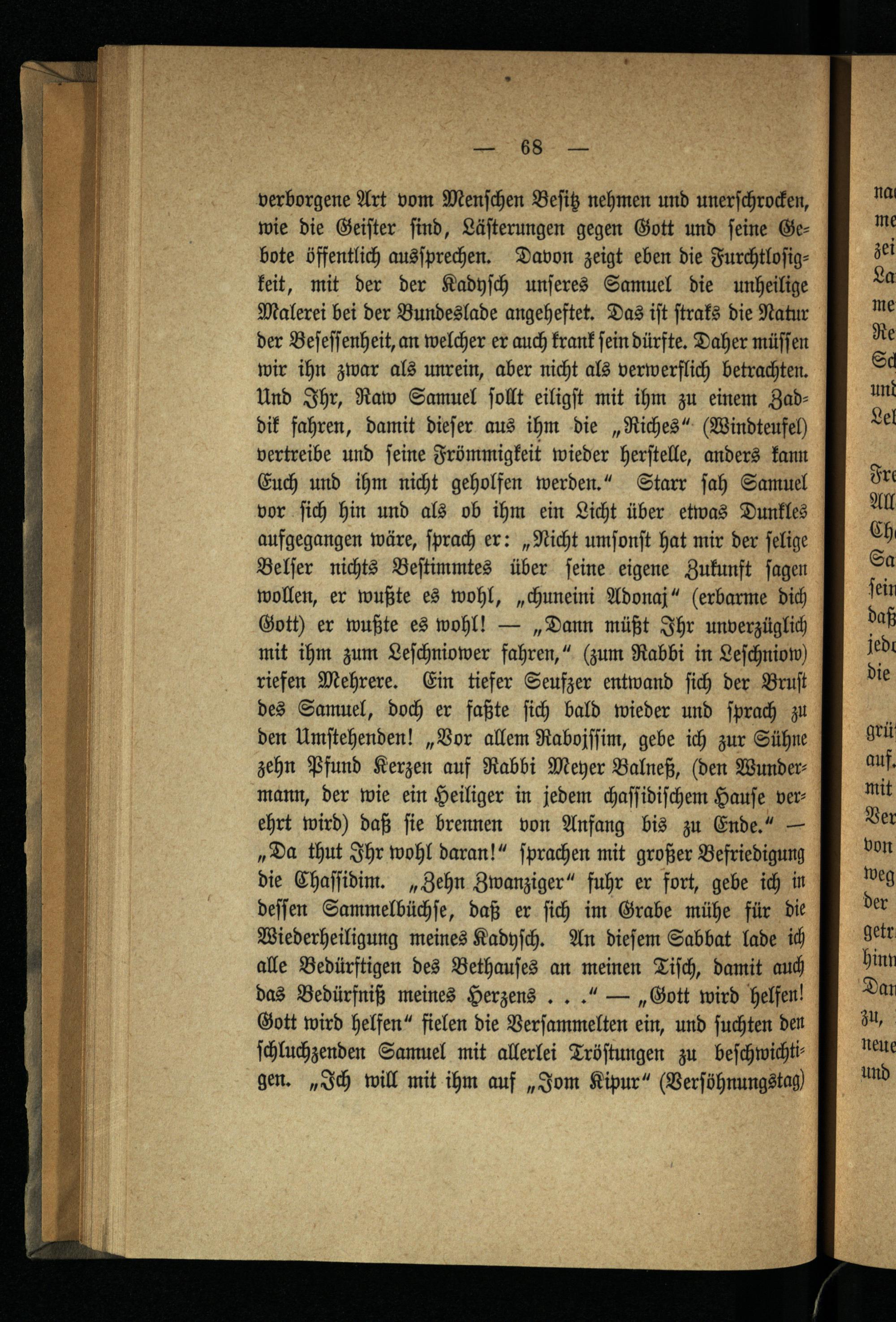 verborgene Art vom Menſchen Beſitz nehmen und unerſchrocken, wie die Geiſter ſind, Läſterungen gegen Gott und ſeine Gebote öffentlich ausſprechen. Davon zeigt eben die Furchtloſigkeit, mit der der Kadyſch unſeres Samuel die unheilige Malerei bei der Bundeslade angeheftet. Das iſt ſtraks die Natur der Beſeſſenheit, an welcher er auch krank ſein dürfte. Daher müſſen wir ihn zwar als unrein, aber nicht als verwerflich betrachten. Und Ihr, Raw Samuel ſollt eiligſt mit ihm zu einem Zaddik fahren, damit dieſer aus ihm die„Riches“(Windteufeh vertreibe und ſeine Frömmigkeit wieder herſtelle, anders kann Euch und ihm nicht geholfen werden.“ Starr ſah Samuel vor ſich hin und als ob ihm ein Licht über etwas Dunkles aufgegangen wäre, ſprach er:„Nicht umſonſt hat mir der ſelige Belſer nichts Beſtimmtes über feine eigene Zukunft Jagen wollen, er wußte es wohl,„chuneini Adonaj“(erbarme dich Gott ) er wußte es wohl!—„Dann müßt Ihr unverzüglich mit ihm zum Leſchniower fahren,“(zum Rabbi in Leſchniow) riefen Mehrere. Ein tiefer Seufzer entwand ſich der Bruſt des Samuel, doch er faßte ſich bald wieder und ſprach zu den Umſtehenden!„Vor allem Rabojſſim, gebe ich zur Sühne zehn Pfund Kerzen auf Rabbi Meyer Balneß,(den Wundermann, der wie ein Heiliger in jedem chaſſidiſchem Hauſe verehrt wird) daß ſie brennen von Anfang bis zu Ende.“— „Da thut Ihr wohl daran!“ ſprachen mit großer Befriedigung die Chaſſidim.„Zehn Zwanziger“ fuhr er fort, gebe ich in deſſen Sammelbüchſe, daß er ſich im Grabe mühe für die Wiederheiligung meines Kadyſch. An dieſem Sabbat lade ich alle Bedürftigen des Bethauſes an meinen Tiſch, damit auch das Bedürfniß meines Herzens...“—„Gott wird helfen! Gott wird helfen“ fielen die Verſammelten ein, und ſuchten den ſchluchzenden Samuel mit allerlei Tröſtungen zu beſchwichtigen.„Ich will mit ihm auf„Jom Kipur “(Verſöhnungstag